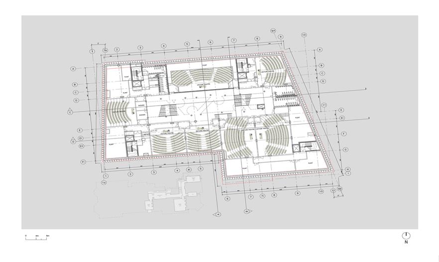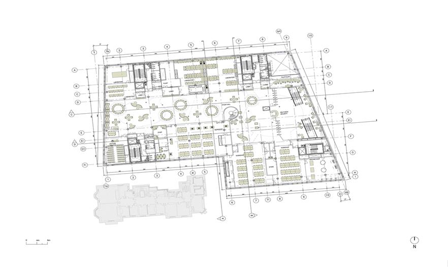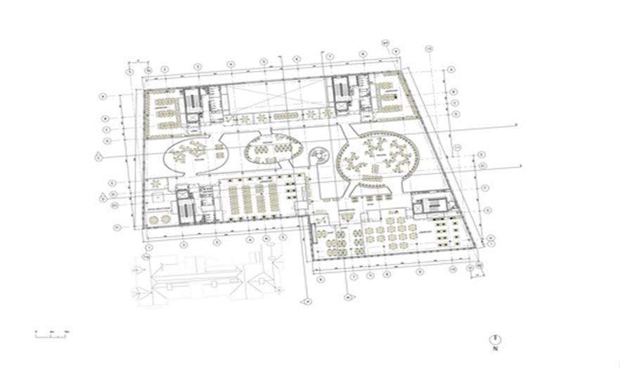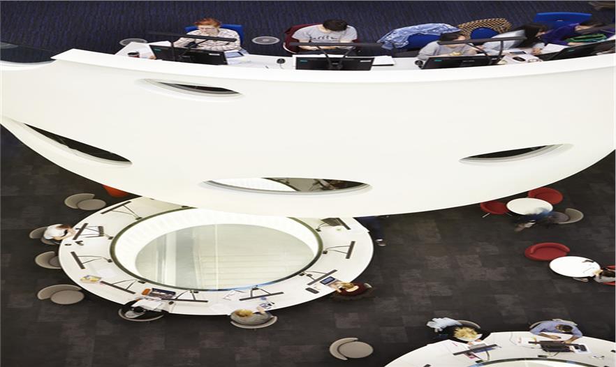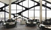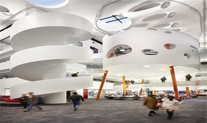在自然通風的大廳里,設置了很多弧形的“豆莢”式的空間,專為非正式的個人和小組學習使用。教室、實驗室和辦公室排列在北面和南面的中庭里,那里有全高玻璃門面,具有最好的視野空間,其教學空間顯示出了其最好的工程教育和研發(fā)團隊。室內(nèi)光線來自于屋頂照射進來的日光,專門為一層中庭設計的玻璃課桌讓自然光線能夠穿透底層照到地下室層面,并且還能創(chuàng)建聲分離。一系列階梯教室位于地下一層,一共有1500個座位,其中最大的一個擁有400個座位。