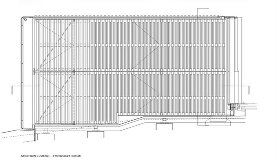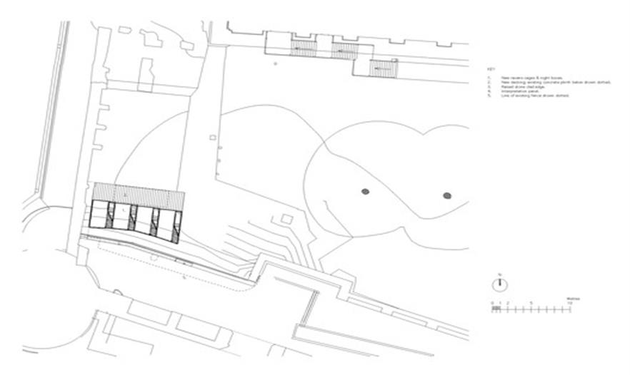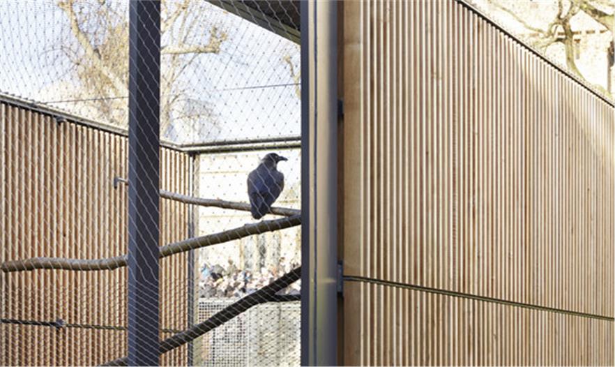 完成的護(hù)圍采用了橡樹板條結(jié)構(gòu),垂直于草地坡。橡樹結(jié)構(gòu)還包含了烏鴉的睡覺盒子。開放空間之間覆蓋著超細(xì)不銹鋼絲網(wǎng),為這些鳥創(chuàng)造出了4個安全的休閑區(qū)。從正面看,結(jié)構(gòu)簡單,但鳥架子上的木結(jié)構(gòu)制作精細(xì),他們的背景就是標(biāo)志性的白塔。大型滑動屏風(fēng)為后面護(hù)圍的開口部分提供了通道,同時還能保持透明。