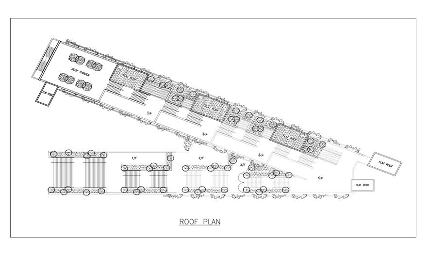 整塊巨大地面層為花園所覆蓋,未設(shè)有壁龕,其設(shè)計(jì)目的是打造出一條在節(jié)日期間促進(jìn)人潮流動(dòng)的大道。建筑頂部實(shí)際上是寬闊的景觀(guān)樓梯,將有效促進(jìn)人潮的流動(dòng),同樣還是安靜之處。
