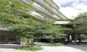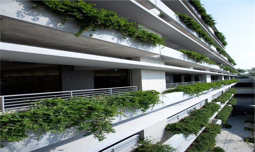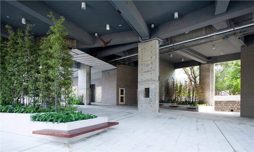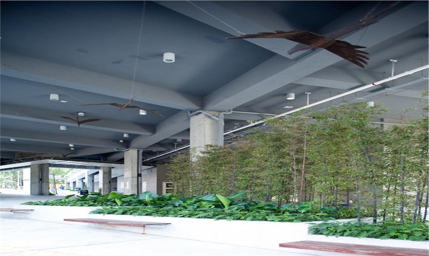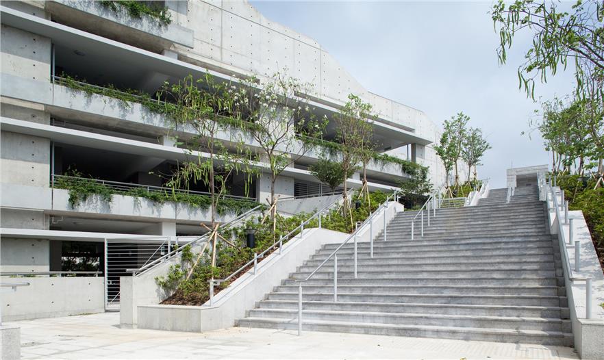 殯儀館每層周邊及地面層柱腳均種植著垂枝植物如金銀花和多葉爬藤,它們的存在使得建筑與周?chē)淖匀画h(huán)境融為一體。為保留基地的原有綠化景觀(guān),受影響的樹(shù)木在正式建造前得到移植。一棵大榕樹(shù)被移至基地的東端,已生長(zhǎng)為一株最受關(guān)注的綠化植物。