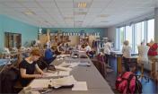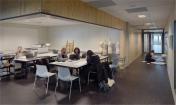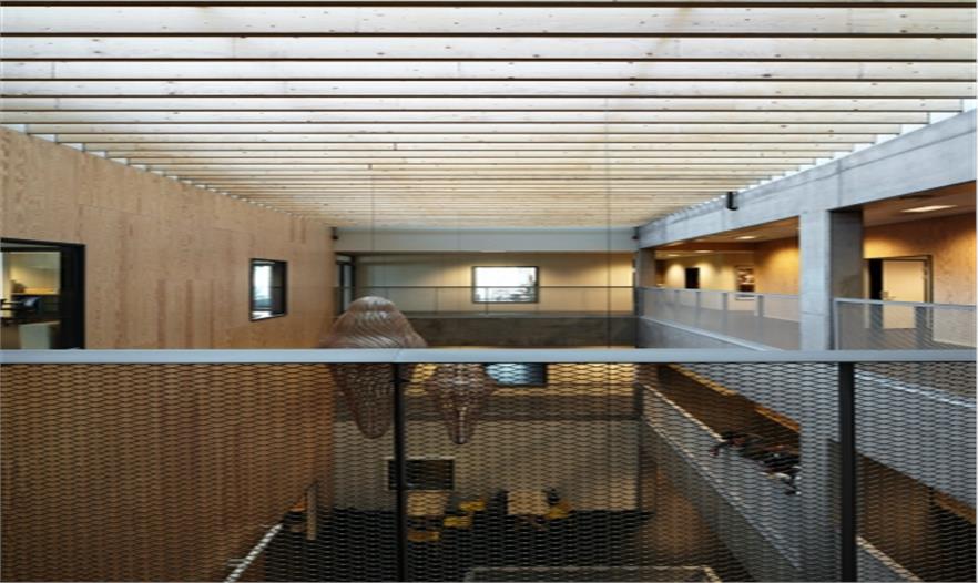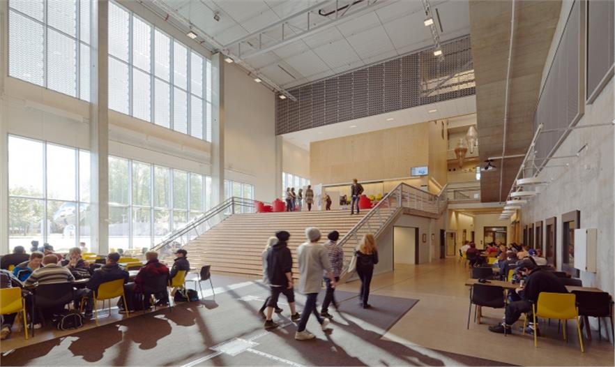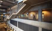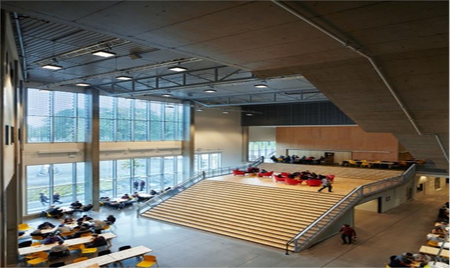 該建筑的中心是The Hangar,是一個(gè)半掩蓋的開放空間,是學(xué)生和公共通道相遇的地方。它提供了一個(gè)可進(jìn)入、有遮蓬的戶外空間,學(xué)生和公眾能夠在此開展討論會、音樂會和展覽。
