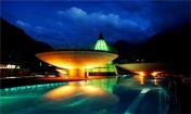 水穹頂溫泉度假村位于風(fēng)光如畫的奧地利山區(qū),其傾斜的錐形建筑形態(tài)模擬了山區(qū)的環(huán)境特點(diǎn)。這里每年可以容納35萬游客,設(shè)計(jì)旨在創(chuàng)建當(dāng)?shù)貥?biāo)志性景觀,為游客創(chuàng)造熟悉的阿爾卑斯高山氛圍。從外表看,錐形建筑連接了三個(gè)懸吊在空中的圓形水池,配有水下音樂和多種照明效果。鋸齒形屋頂有觀景臺(tái),形同周邊的高山外形和材質(zhì)。建筑整體采用了當(dāng)?shù)夭杉氖摹F渌蓍e設(shè)施包括傳統(tǒng)25米泳池以及獨(dú)立的兒童設(shè)施。總體而言,2200平米的水上設(shè)施采用地下1.9公里取水的水庫經(jīng)過過濾而成的溫泉水。