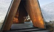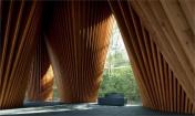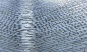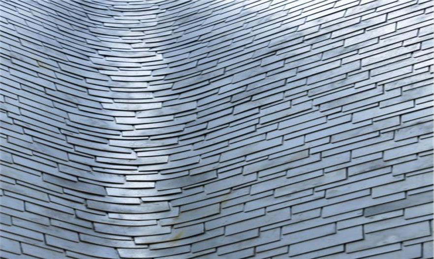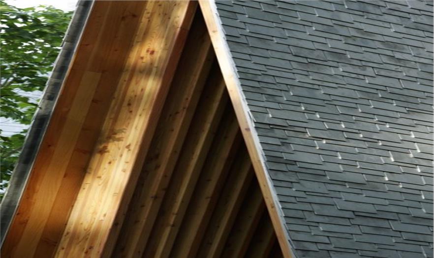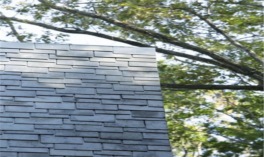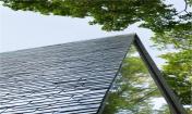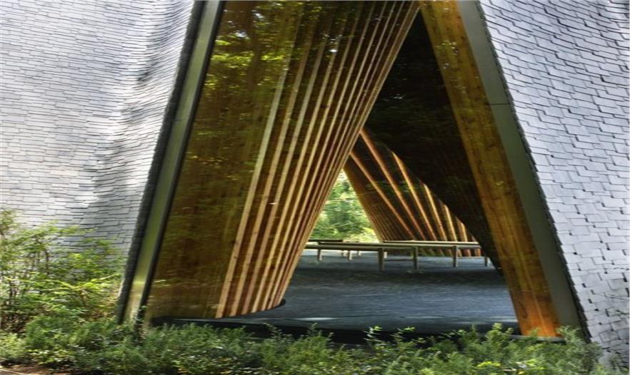 建筑的墻體向上傾斜,相互支撐的柱體形成倒“V”的造型,日本人稱之為“Gassho-zukuri”,是一種日本傳統(tǒng)的結構形式,與合掌祈禱的形狀相類似。建筑師在建筑的各個方向上都運用了這一造型,屋頂結構因此必須承受水平和垂直兩個方向的應力。這一設計消除了對抗震墻體的需求,同時也創(chuàng)造了Gassho-zukuri一種新的形式。除特殊的結構設計外,建筑師運用表面細膩的材料讓傾斜的柱體更為精致,且通過細節(jié)設計將金屬節(jié)點和隆起的梁體隱藏起來,因而人們看到的只是一座由一系列從地上向上攢起的柱體構成的建筑。接下來,屋頂必須能夠為這座復雜的結構體提供長久的庇護。建筑師同當?shù)毓そ澈献?,研發(fā)出一種面積180x200mm鑄鋁板。4mm的厚度是經久耐用的最小值,也是人工可彎曲的最大值。因此每一塊擁有不同曲率的鋁板都是工匠的精神的體現(xiàn)。