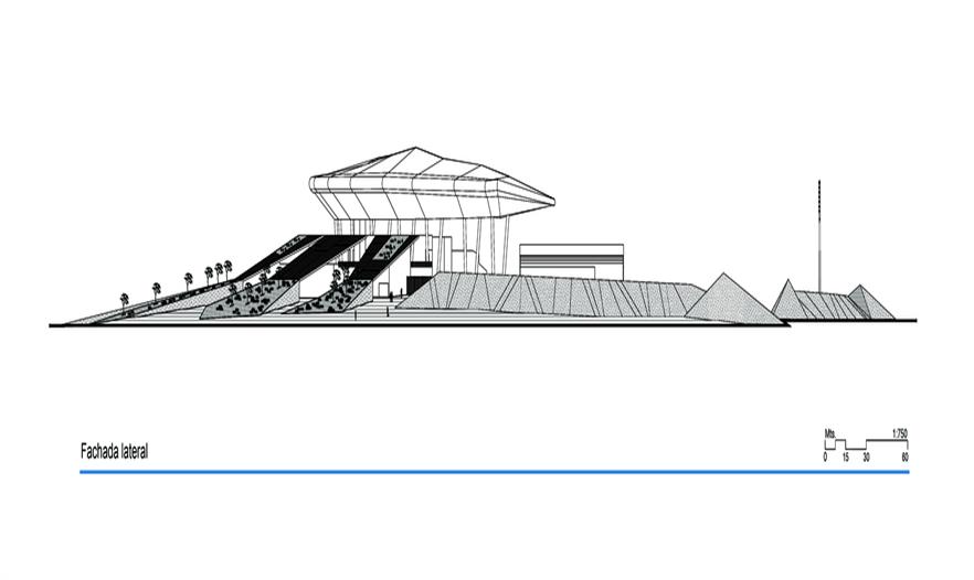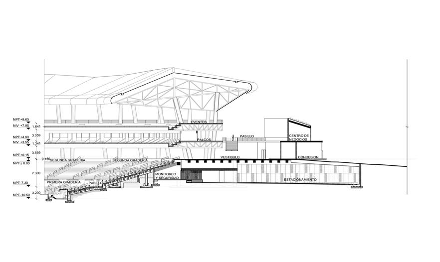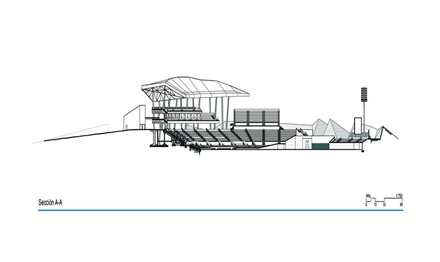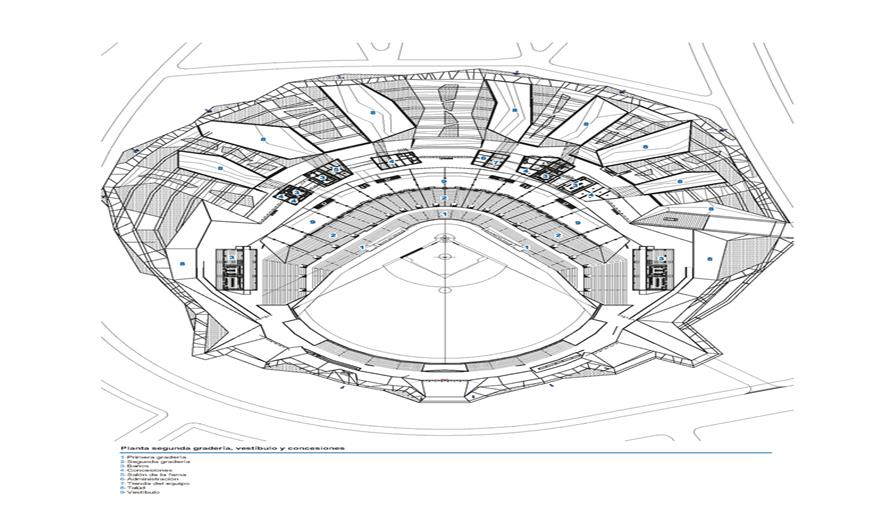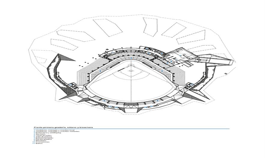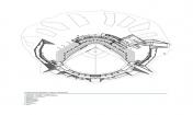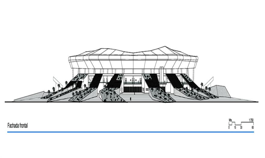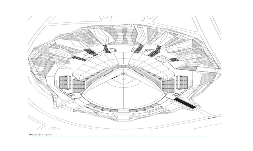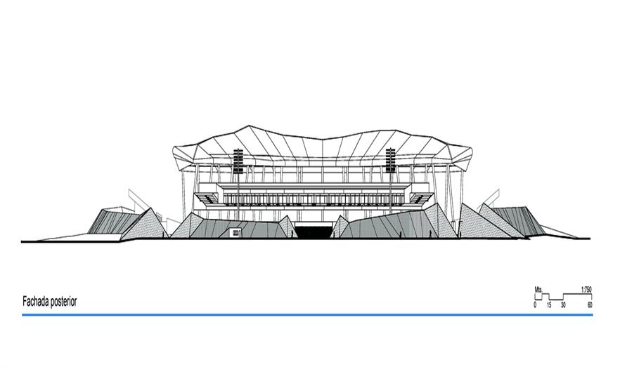 該建筑被定義為成一個(gè)單包絡(luò)的形式,并從基礎(chǔ)開始構(gòu)建這個(gè)運(yùn)動(dòng)場的幾何體,遮蓋范圍會(huì)受到周邊斜坡影響。這些體育場內(nèi)部的建設(shè)內(nèi)容會(huì)和景觀建設(shè)一起進(jìn)行,在體量之間進(jìn)行環(huán)境規(guī)劃,并創(chuàng)建觀眾和球員的在體育場的進(jìn)出通道。