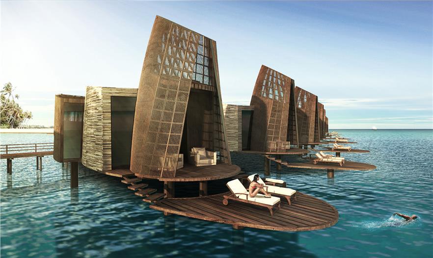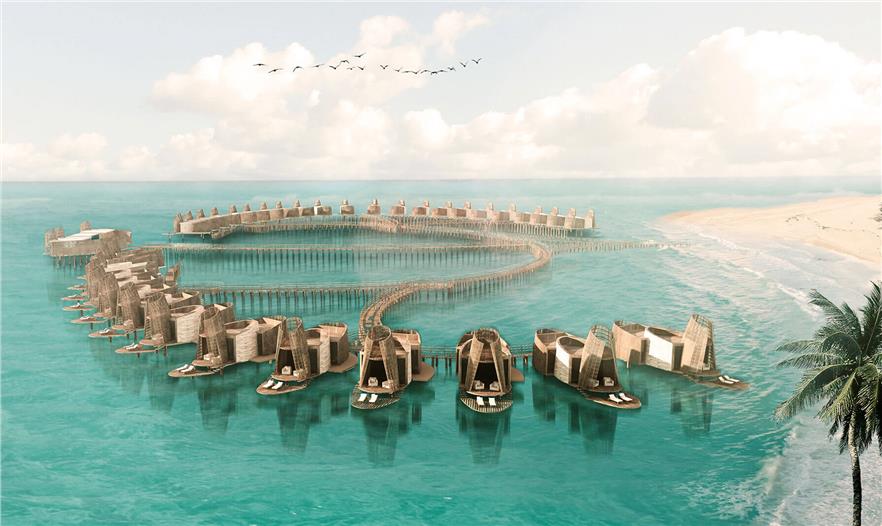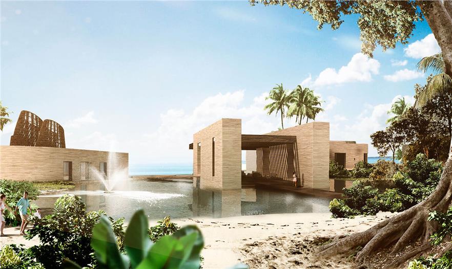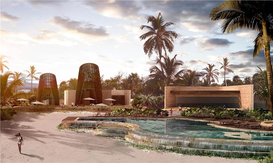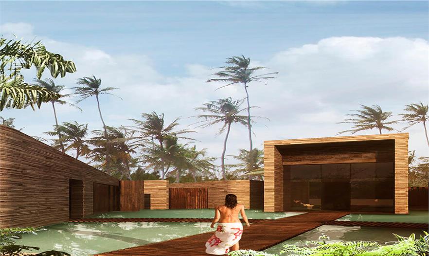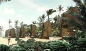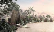 其主要的建筑理念是基于瑪雅元素,如金字塔、傳統(tǒng)的瑪雅房屋、瑪雅歷法以及天然井等。主體規(guī)劃包括套房、干欄屋、溫泉浴場(chǎng)、通用區(qū)域、住宅區(qū)和服務(wù)區(qū),沿著島嶼沿線分布,以求占據(jù)最小的區(qū)域面積、種植大量的植被、觀賞優(yōu)美的景色、愉快的散步以及產(chǎn)生最小的影響。該布局將公共區(qū)域和溫泉浴場(chǎng)設(shè)在中心,一邊是酒店區(qū),另一邊是住宅區(qū),既能分離又能融合。