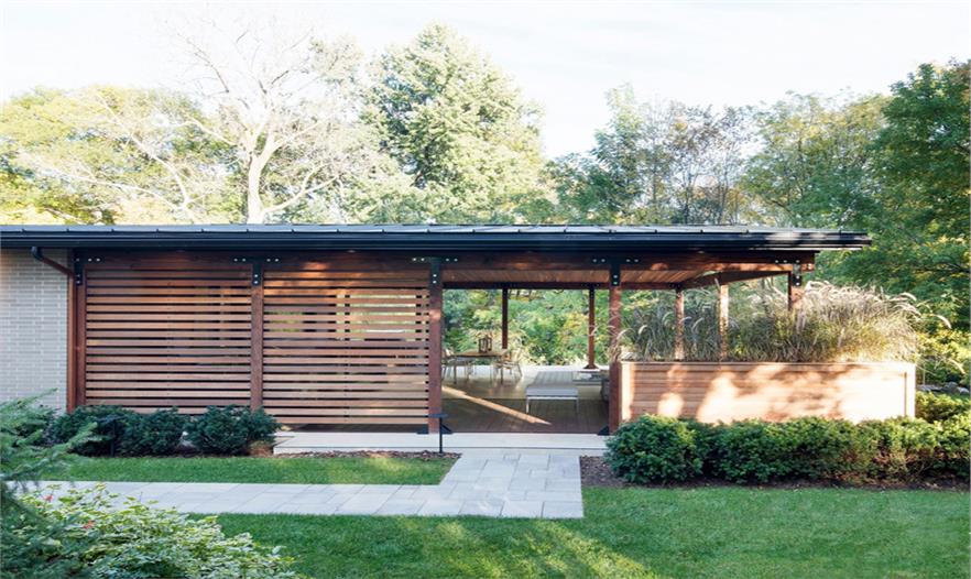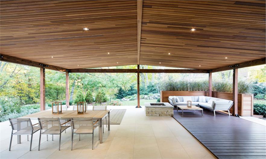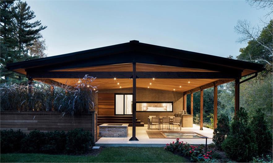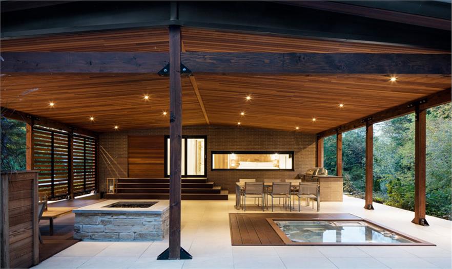 該房屋的一大特色是有蓬蓋的戶外庭院區(qū),位于該房屋的右手邊,是用于戶外燒烤區(qū)和用餐完美區(qū),還建有溫泉和帶有壁爐的休息區(qū)。