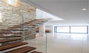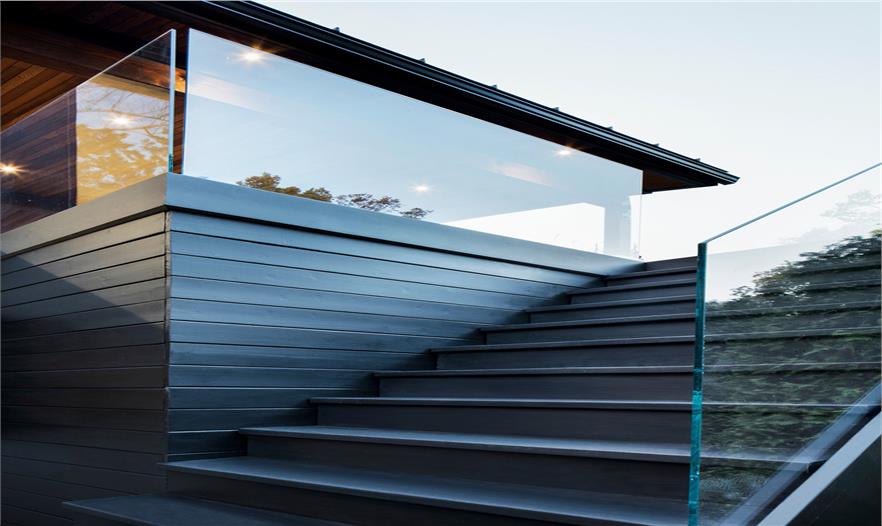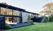從戶外庭院下樓就是后院。這個庭院修整整齊、鋪設(shè)有腳踏石,引導(dǎo)人們前往該房屋主要的起居空間。日光透過大型玻璃進(jìn)入室內(nèi),室內(nèi)空間明亮、簡潔。