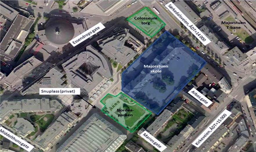 項(xiàng)目位于挪威奧斯陸地區(qū)中心位置,是對當(dāng)?shù)豈ajorstuen校園的改造設(shè)計(jì),周邊以高層建筑為主,學(xué)校只占據(jù)了很小尺度的城市空間。該學(xué)??扇菁{800名學(xué)生。校園中有一個(gè)五層的教學(xué)樓,它始建于1908年,歷史氣息非常濃厚,校內(nèi)設(shè)施完善,具有保護(hù)價(jià)值,值得當(dāng)代景觀設(shè)計(jì)學(xué)習(xí)借鑒。
