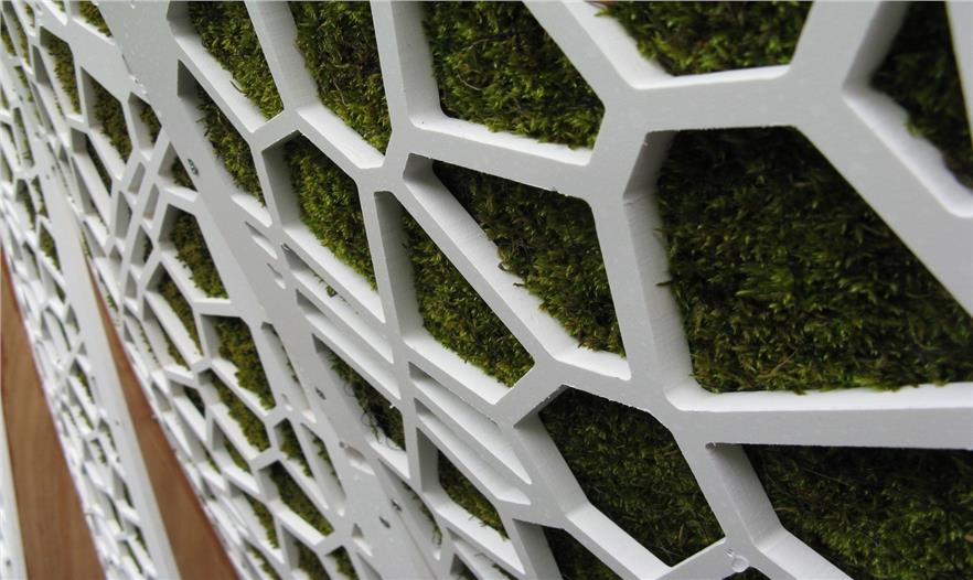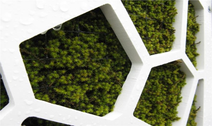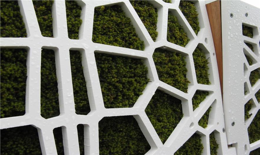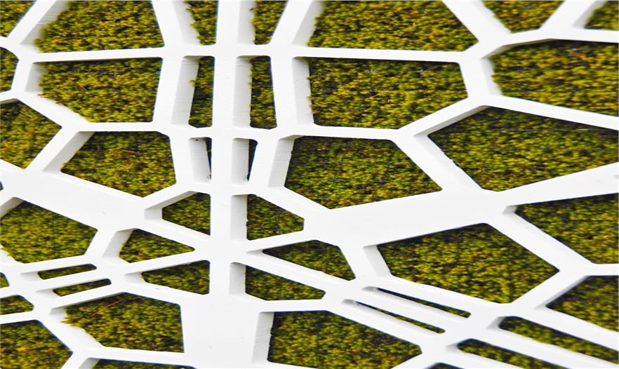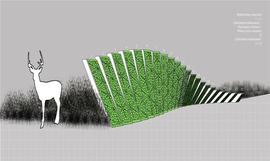 設(shè)計(jì)師根據(jù)不同的微氣候以及不同品種苔蘚的生長條件進(jìn)行進(jìn)行苔蘚布局。其中前11個(gè)單元格種滿了砂蘚(Niphotrichum canescens,一種喜光植物),第12單元格種上了草蘚(Callicladium haldanianum),其余的單元格(第13格至第22格)混合種植著草蘚(Callicladium haldanianum)及其他喜陰森林植物,比如赤莖蘚(Pleurozium schreberii)、毛梳蘚(Ptilium crista-castrensis)等等。在拼裝之前,裝置的各個(gè)部件已經(jīng)在Cambridge預(yù)制好。利用了哈佛實(shí)驗(yàn)室內(nèi)各種可以使用的數(shù)字加工技術(shù)以及手工制造設(shè)備。按照拼裝流程,園圃在兩周之內(nèi)實(shí)現(xiàn)了組裝、成形,并安置在場地之上。
