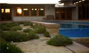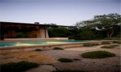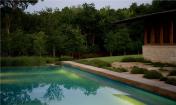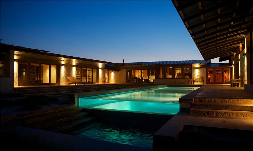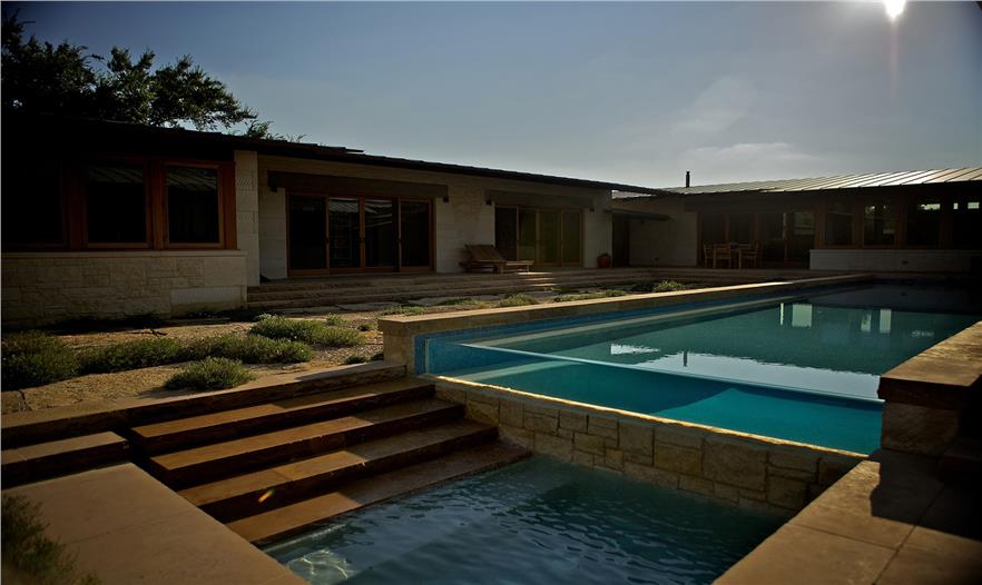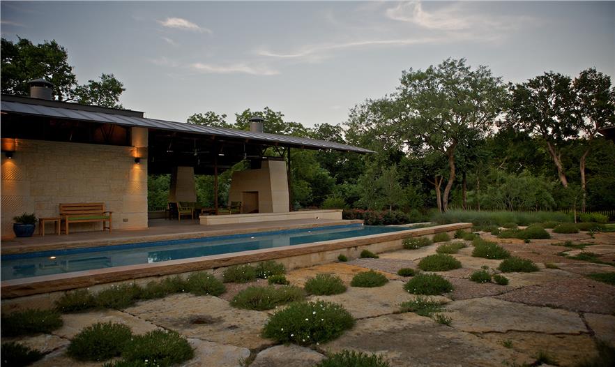 該住宅建筑位于1公頃(2.5英畝)的郊區(qū)后面,隱于現(xiàn)有溪流的河岸帶附近。該設(shè)計建造出一系列的臺地,營造流動感,并用于舉辦各種活動。中央庭院的主臺地位于該區(qū)域的中心。該空間內(nèi)無邊緣游泳池與遠處的自然景觀和溪流構(gòu)成視覺聯(lián)系。平面視圖是石灰石板路,種有一簇簇本土植物,過濾雨水到當(dāng)?shù)厮爸校軆Υ孢_2萬加侖的灌溉水。整個區(qū)域地表材料的變化勾勒出其他臺地,產(chǎn)生地面穿梭的韻律感。帶有背光玻璃渣的石頭墻成為該區(qū)域的焦點,吸引遠處的游客前來。