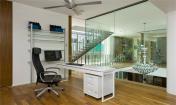 主起居空間對面是游泳池。家庭辦公室能俯瞰著餐桌上空的開放空間。