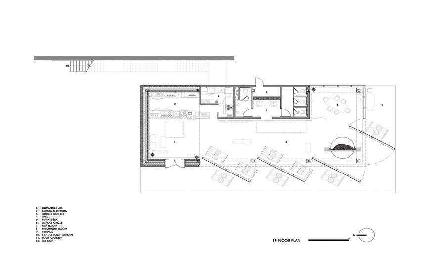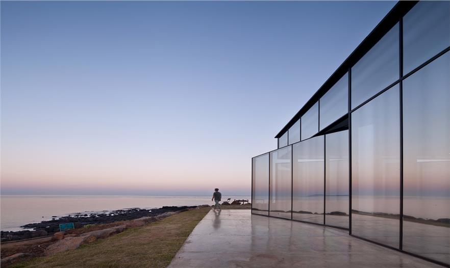 設(shè)計(jì)師將單層樓上的屋頂平臺(tái)擴(kuò)展到了周圍的環(huán)境之中,成為了一個(gè)面向四周的觀景臺(tái)。裝在黑色不銹鋼框架上的大反射玻璃能夠在根據(jù)需求隨意的打開或關(guān)閉,它能夠擋住外面的視線,并能夠防止內(nèi)外的用戶在視覺上產(chǎn)生交叉,這樣能夠?yàn)槭覂?nèi)的人們提供出沒有干擾的自然環(huán)境景觀,人們可以在周圍美麗風(fēng)景環(huán)繞下休閑娛樂。