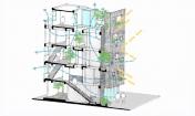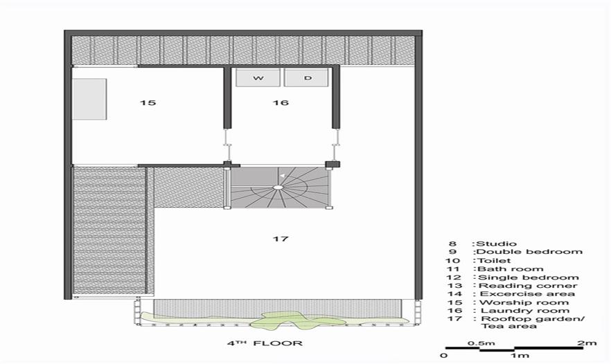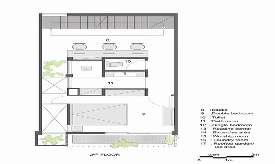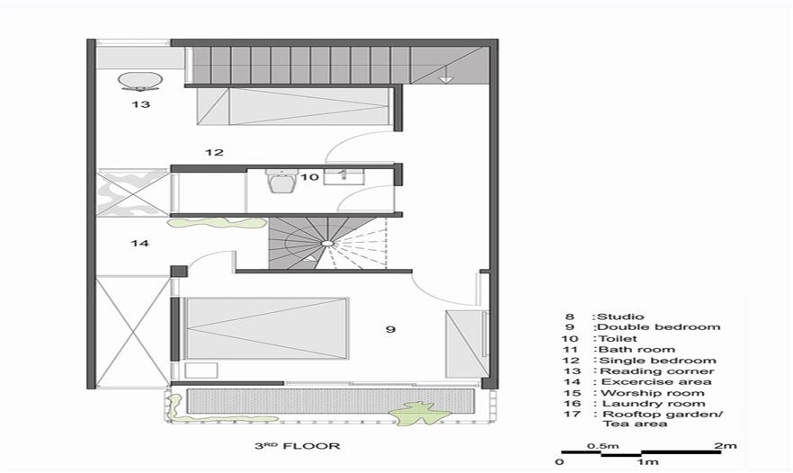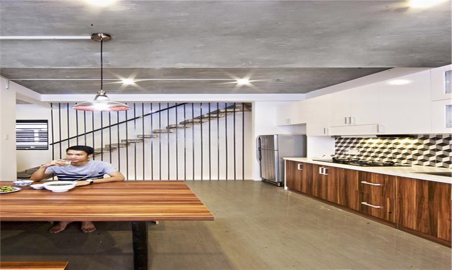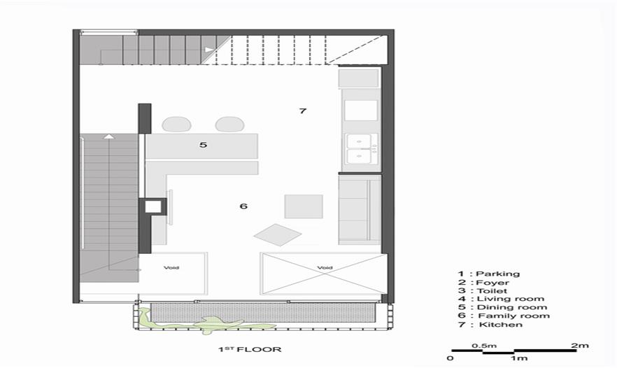 Q10住宅將要解決一個(gè)四口之家的居住,退休的父母以及一對(duì)兒女。這種狀況也許很快會(huì)被即將到來的第三代打破。地塊寬5米長(zhǎng)9米,想要擁有一個(gè)中央的庭院看來基本不太可能。這樣的話對(duì)于一個(gè)又窄又長(zhǎng)的“胡同”來說,陰暗潮濕將是必不可少的特征。那么現(xiàn)在可以請(qǐng)?jiān)O(shè)計(jì)師閃亮登場(chǎng)了,來自Studio8工作室的設(shè)計(jì)師想出了一個(gè)對(duì)策,在房子一側(cè)設(shè)計(jì)了一個(gè)一米寬的通高空間,通過計(jì)算,剛剛好最大程度地滿足光照與通風(fēng)條件。