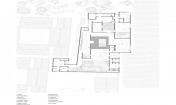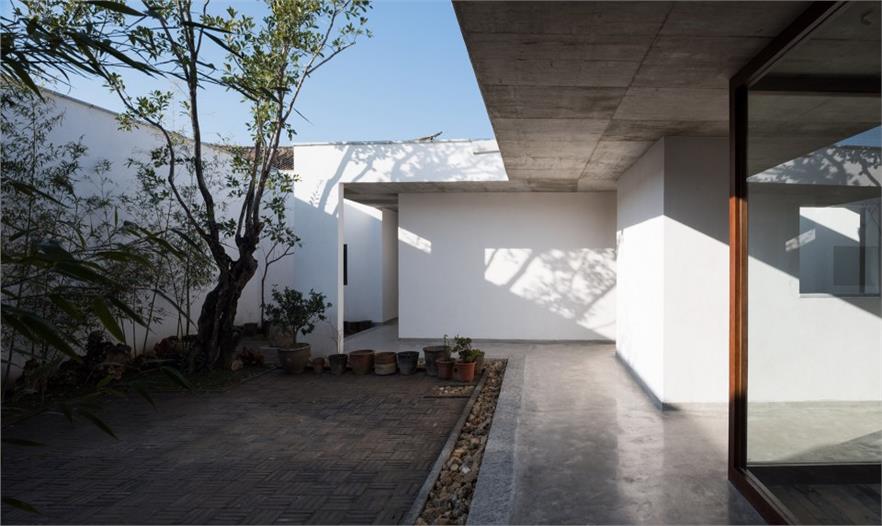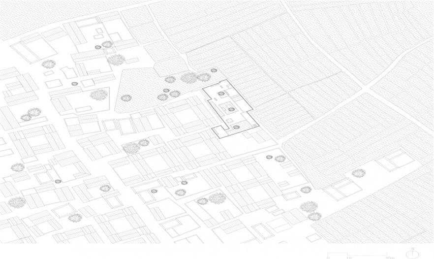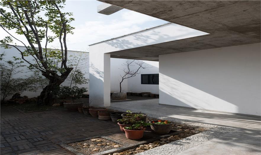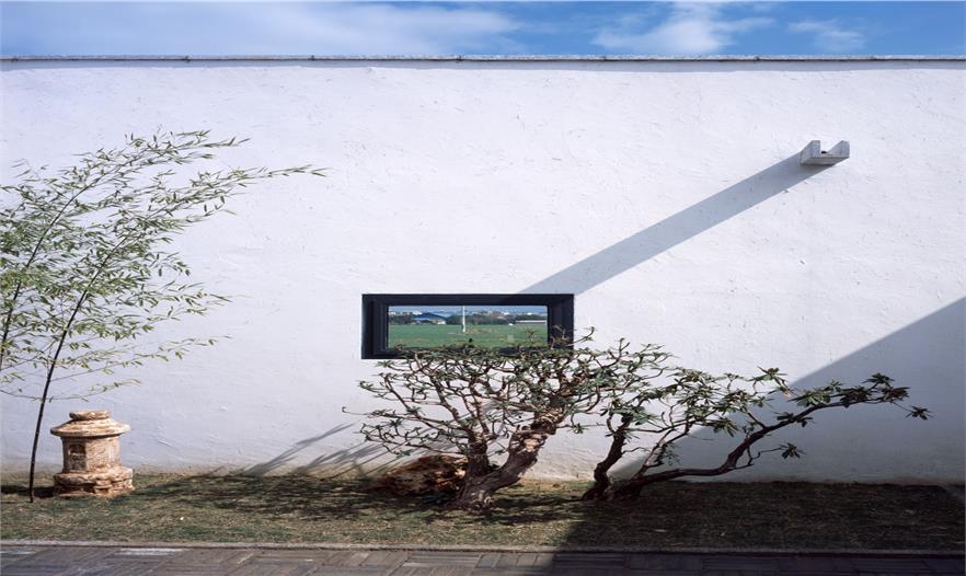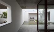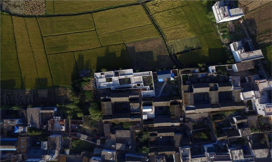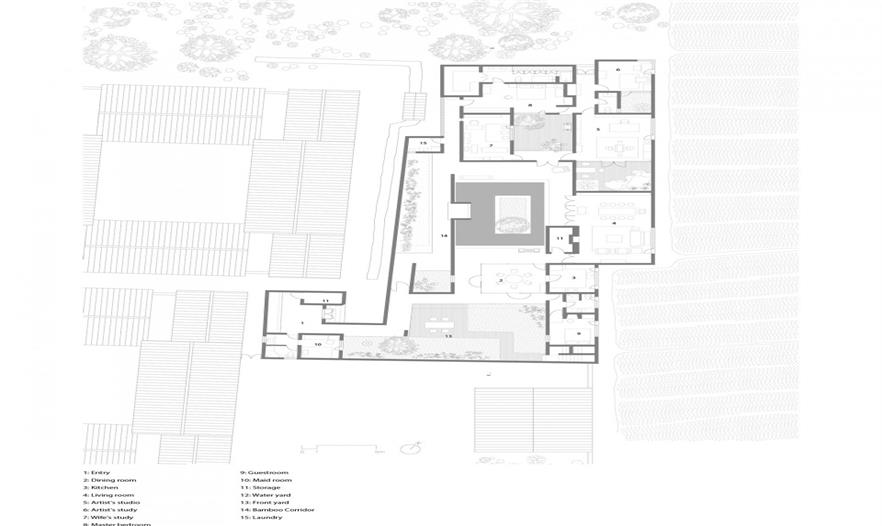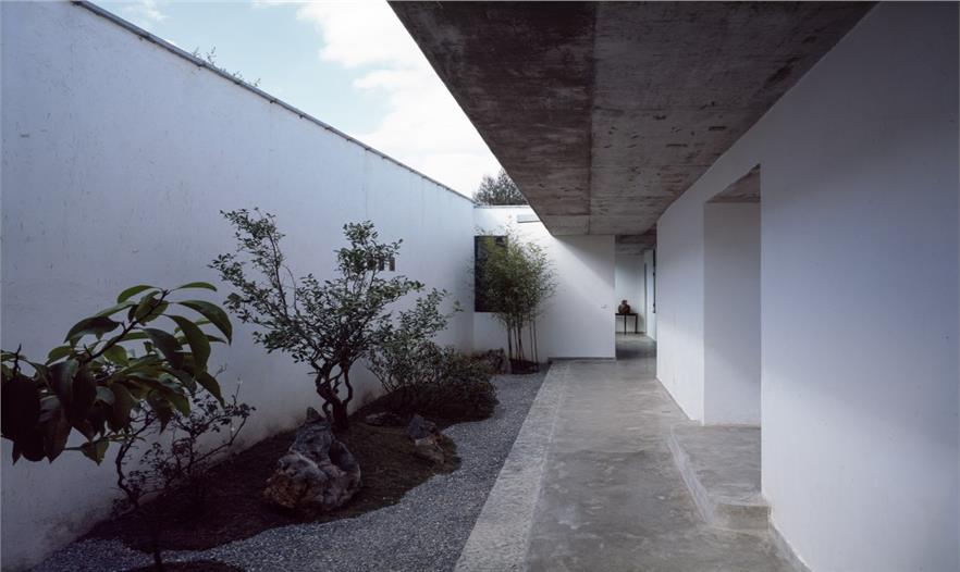 這座新建成的院宅的內(nèi)向性與其周邊傳統(tǒng)院落的內(nèi)向性相合。草筋白(石灰混合草筋的外墻處理)——在大理地區(qū)是一種常見且廉價的外立面材料——同時也把新建筑與其周邊環(huán)境聯(lián)系起來。這座房子被劃分為門廳、前庭、中庭以及后庭(主人使用的私密區(qū)域)。九個不同大小的院子縮小了傳統(tǒng)院落住宅的庭院尺度,并把院落與一系列的功能房間聯(lián)系起來。位于西南處的入口序列包含兩次180度的轉(zhuǎn)向,引領(lǐng)訪客到達(dá)南部的院子。私密的區(qū)域圍繞著四個尺度、朝向各不相同的庭院來組織。因此,陽光從不同的方向被引入建筑內(nèi),人們可以察覺到空間氛圍在一天當(dāng)中隨時間的變化。
