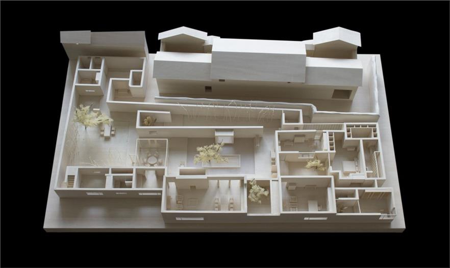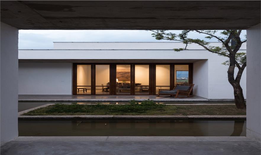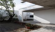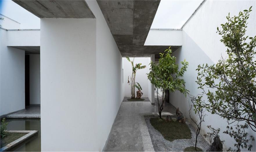 對于這座房子而言,結(jié)構(gòu)元素是不希望被看到的。通過將墻厚設(shè)計在200mm的厚度,被刷上外墻材料后,柱子和填充墻將無法分辨。在南部院子,有一邊達(dá)到了最大的跨度8m,這要求梁的尺寸要達(dá)到600mm高。然而,不同尺寸的梁通過將它們反置在樓板之上而變得不可見。在這里,結(jié)構(gòu)的表達(dá)是次要的,也使得光影、水面、植物以及業(yè)主收藏的家具得以成為表達(dá)效果的主體。