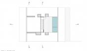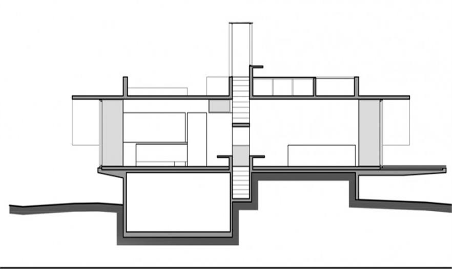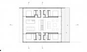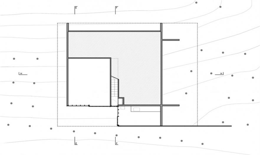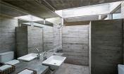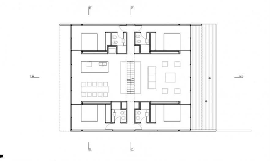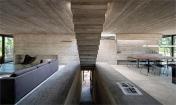 木板定模的混凝土構(gòu)成了建筑空間,并在邊界處留有長(zhǎng)條狀的空隙用于安裝玻璃。由于這幢房子是以休閑為目的設(shè)計(jì)的,所以其功能主要都布置在同一層平面中,起居室和廚房區(qū)占據(jù)了該層平面的大部分面積。四個(gè)臥室及個(gè)人衛(wèi)生間置于建筑的四個(gè)角上,以保證最大化彼此之間的私密性??紤]到平面的比例以及較大的進(jìn)深,建筑使用天窗為室內(nèi)照明。此外,房屋中央設(shè)置的樓梯幫助將中部空間分隔開(kāi)而無(wú)需使用墻壁,該樓梯一直延伸到屋頂上形成一處光井,并引向屋頂?shù)穆杜_(tái)和游泳池。