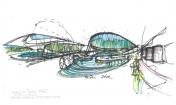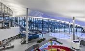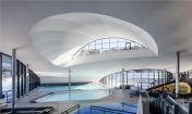 屋頂?shù)母叨茸尳ㄖ軌虼蜷_足夠的空間與周圍環(huán)境進(jìn)行交流,這時(shí)的大廳在玻璃幕墻環(huán)繞下立面充滿了自然光線。隨著季節(jié)的變化大自然中的不同氣息會(huì)走進(jìn)建筑中,比如夏天里的綠色,冬天里的白雪。前來游泳的游客能夠看到Gravelles河的一條分支溪流。在屋頂有一個(gè)特殊的開口,由木頭和玻璃制成,朝南面,它能夠進(jìn)一步的為室內(nèi)帶來自然光線。建筑中的這些特點(diǎn)突出了空間之間團(tuán)結(jié)的感覺。景觀和建筑就這樣融為了一體。