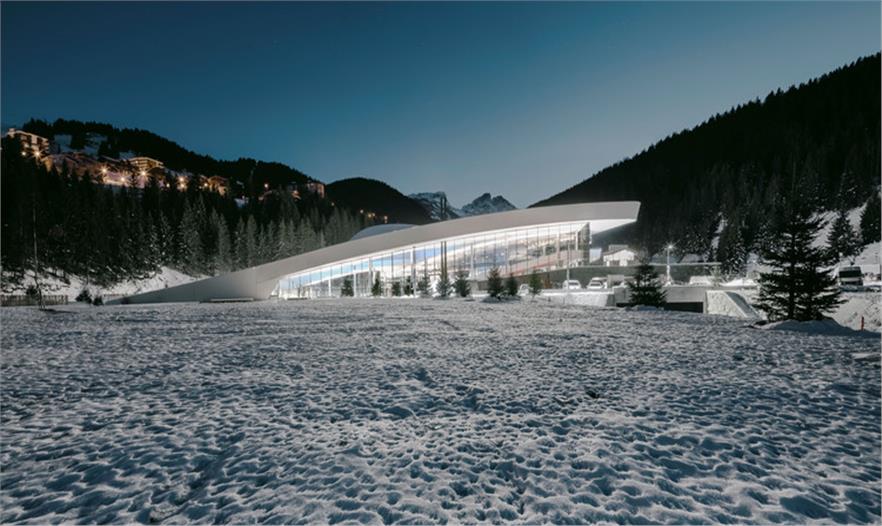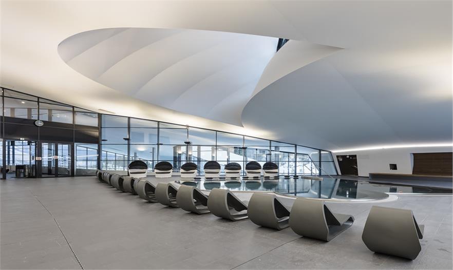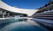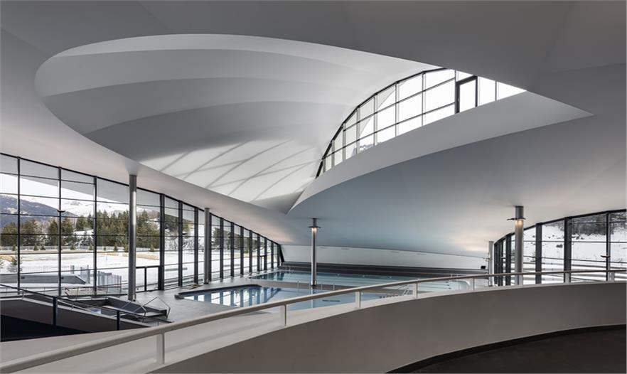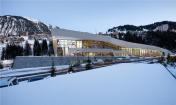 高雪維爾位于法國(guó)阿爾卑斯山中部,它包含了幾個(gè)不同的小鎮(zhèn),橫跨了不同高度的多個(gè)高原。這個(gè)新的水上運(yùn)動(dòng)中心就位于高雪維爾從1650米到1850之間的這個(gè)平臺(tái)上,在兩山之間,其中一面朝向山谷,另一面則面對(duì)著阿爾卑斯山全景。在這個(gè)獨(dú)特的地理環(huán)境中,這個(gè)水上中心需要安裝大量的裝備設(shè)施。從項(xiàng)目設(shè)計(jì)的一開始,整個(gè)設(shè)計(jì)團(tuán)隊(duì)都將注意力放在了如何將建筑完美的融入周圍環(huán)境中。該建筑的屋頂受地形影響設(shè)計(jì)成了一種上升的形態(tài),這也是為了半地下室式的建筑主體有足夠的空間。我們主要選擇了兩個(gè)主要領(lǐng)域,娛樂和放松,他們分別使用兩個(gè)門,擁有合適的透明度和濕度。
