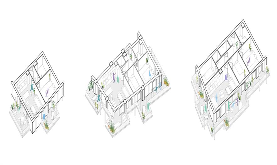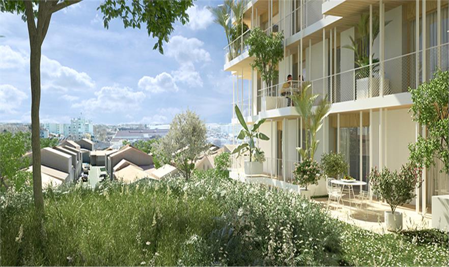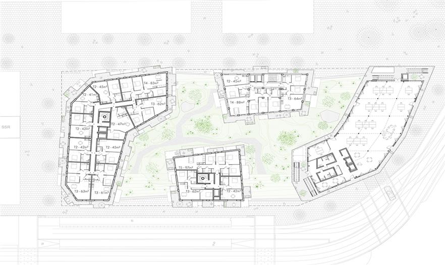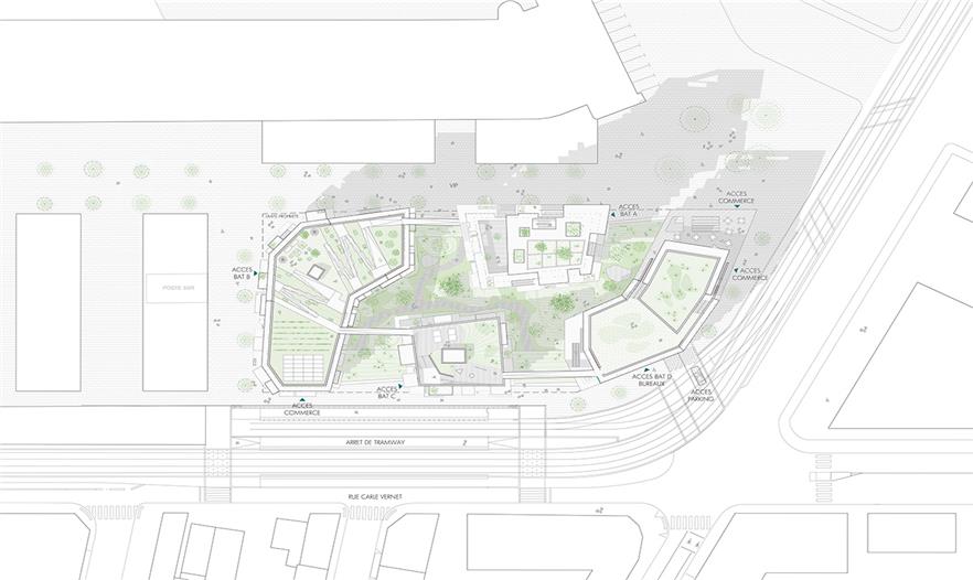 公寓為居民提供了至少一個私人陽臺,許多住宅單元還有更多。甚至有一個圍繞著整個住宅的外部平臺。在地面層有一個位于項目中心的公園,鼓勵人們到此散步、活動。這種外形也是確保開發(fā)區(qū)和周圍環(huán)境和諧共存的一種嘗試,并吸引來自附近車站的行人。
