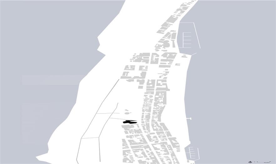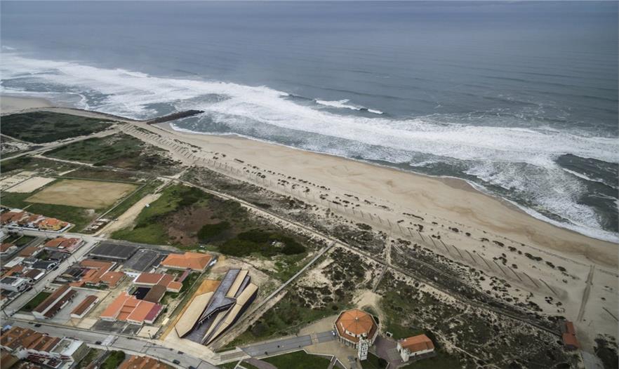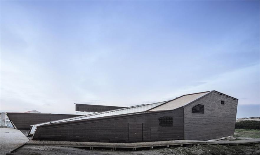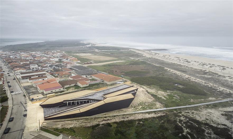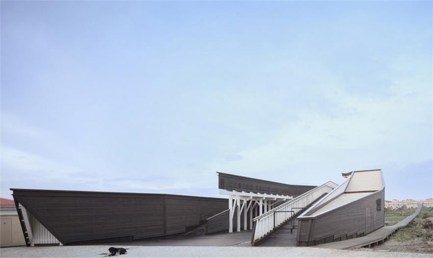 建筑位于Costa Nova海岸沙灘與Nossa Senhora da Saúde大街中間的沙丘地帶。四通八達(dá)的木質(zhì)棧道跨越了沙丘,連接著城市與大海。建筑的東側(cè)沿街道分布著低矮的公寓樓。盡管沙丘的遮擋阻斷了街道和海洋間的視覺(jué)聯(lián)系,但周邊的一切都暗示著海洋就在并不遙遠(yuǎn)的前方。