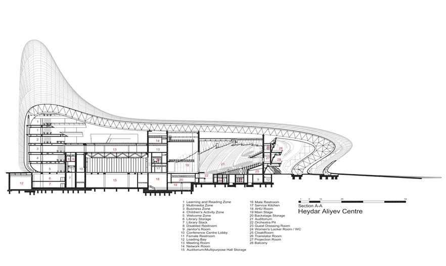 在這個項目中,最具挑戰(zhàn)性的元素之一,無疑是建筑表皮的設(shè)計。我們希望能夠使建筑表面連續(xù),并表現(xiàn)出勻質(zhì)性,為達成這一目標,需要將不同的功能、建造邏輯和技術(shù)系統(tǒng)全部融入建筑的圍護系統(tǒng)中。先進的計算機技術(shù)使得大量的項目參與者能夠完成連續(xù)的控制和復(fù)雜的交流過程。蓋達爾•阿利耶夫文化中心主要由兩個相互協(xié)作的系統(tǒng)組成:混凝土結(jié)構(gòu)和空間架構(gòu)系統(tǒng)。為了營造大尺度的無柱空間,使參觀者體驗室內(nèi)空間的流動性,豎向的結(jié)構(gòu)元素被包裹在圍護結(jié)構(gòu)和幕墻系統(tǒng)中。特殊的表面幾何形促成了非常規(guī)的結(jié)構(gòu)方案,例如引入曲折柱基“boot columns”,使得表面可以由地面翻轉(zhuǎn)到建筑的西側(cè),以及逐漸變細的懸臂梁“楔形榫頭”,支撐面向場地東側(cè)的建筑圍護結(jié)構(gòu)。