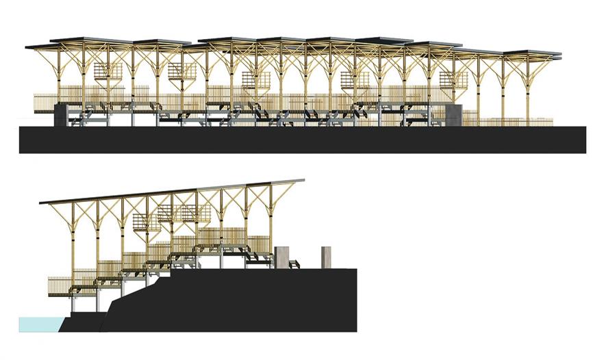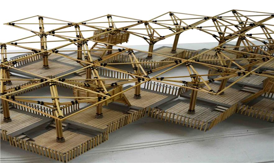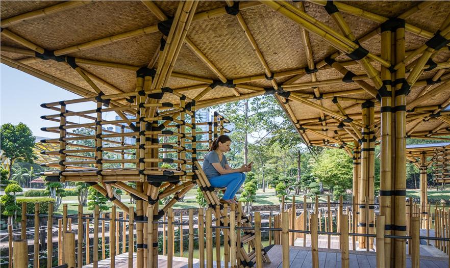 這個(gè)涼亭包括31個(gè)相同的正方形甲板,但位于不同的高度,這樣就會(huì)營造出3維立體的地面。地面以上的都是重復(fù)性的模塊結(jié)構(gòu),全部由竹子建造而成。每個(gè)甲板的中心都會(huì)有一個(gè)樹狀的柱子,用來支撐屋頂。樹屋是竹籃的形狀,靠柱子支撐重量,為涼亭增加了另一個(gè)有趣的元素。
