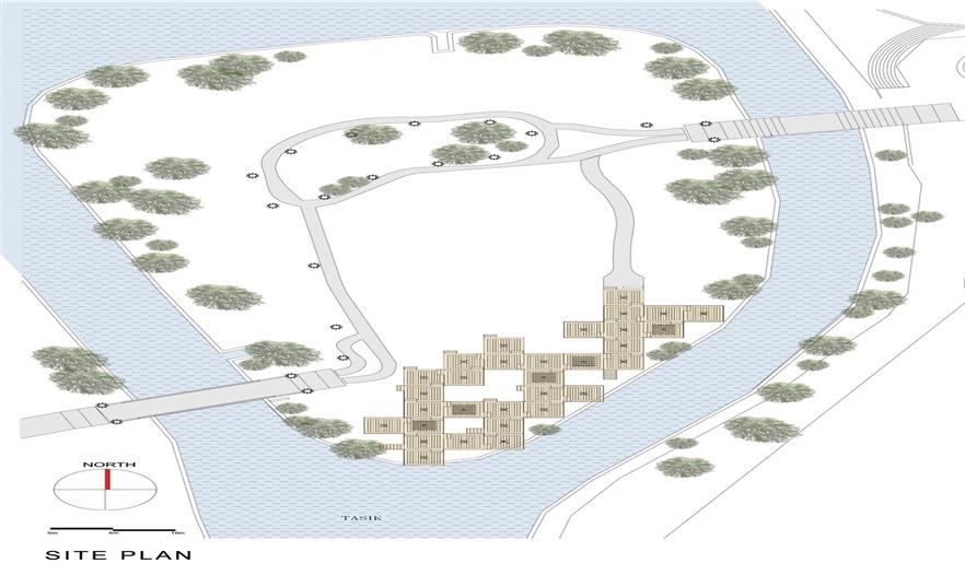 這個(gè)竹屋位于該湖的邊緣,是一個(gè)開放的結(jié)構(gòu),具有不同層次的高架平臺。該竹屋的靈感來源于傳統(tǒng)的地方結(jié)構(gòu)——wakaf,最早是在鄉(xiāng)村中發(fā)現(xiàn)的。這些結(jié)構(gòu)都是獨(dú)立式的遮蓬,任何人都可以在此休息養(yǎng)神。這個(gè)竹屋可以說是由一系列的wakaf結(jié)構(gòu)構(gòu)成了一個(gè)富有動(dòng)態(tài)、有趣的竹子結(jié)構(gòu),和諧地融入到植物園漂亮的綠景中。它為游客提供了許多未定性的空間,可以用作多種用途。