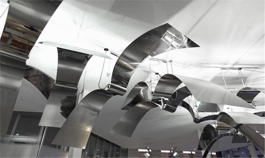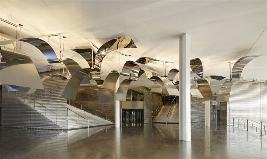 14盞20英尺寬的大型吊燈錯落有致地懸掛在大堂上方,如同14只排成隊列展翅飛翔的信天翁。通過不同尺度模型的反復(fù)試驗(yàn)后,建筑師最終確定了這些曲線的弧度。其實(shí)并不輕盈的信天翁吊燈在燈光的映照下,仿佛擺脫了地球引力般懸浮在空中。而錯落有致的組合形態(tài),讓它們仿佛隨著人們的移動而變化著模樣。光線在天花、金屬地面和吊燈間不斷反射,內(nèi)部空間也顯得愈發(fā)明亮。
