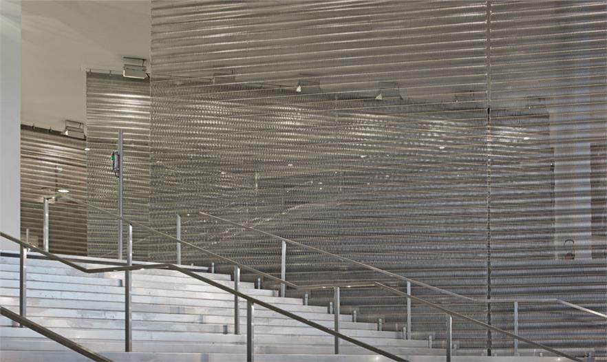 建筑師曾在他們設(shè)計的法國國家圖書館中使用過金屬網(wǎng),而在“城市之光”的大堂設(shè)計中他們再次啟用了這個特殊的結(jié)構(gòu)。為了達(dá)到更好的效果,建筑師對金屬網(wǎng)進(jìn)行了細(xì)致的設(shè)計,再交由專業(yè)人員“編織”,最終得到了26英尺間距的框架和幾乎不可見的接縫??蚣艹霈F(xiàn)在大堂不同角落,帶來通透而舒適的氛圍。