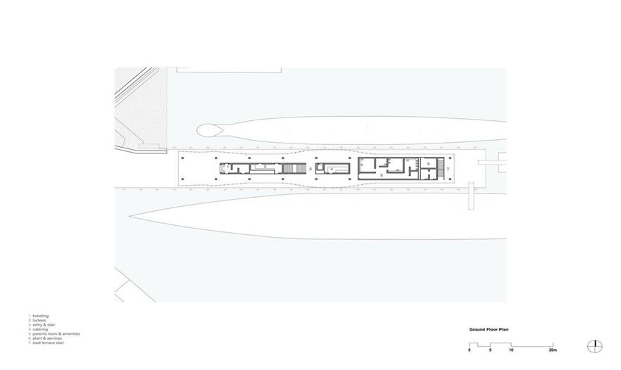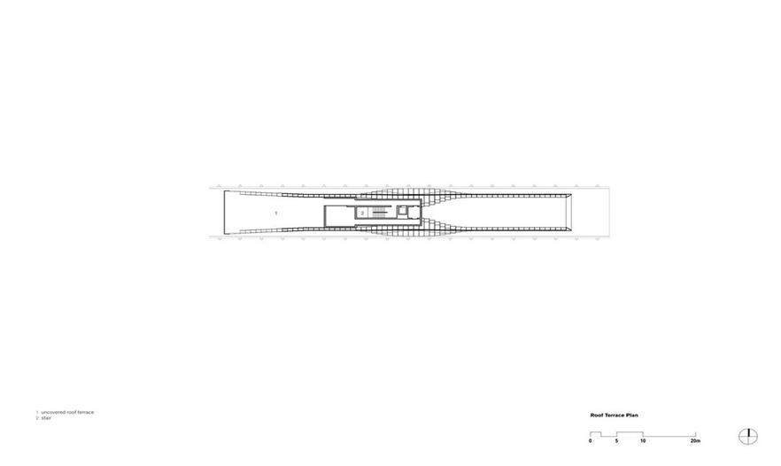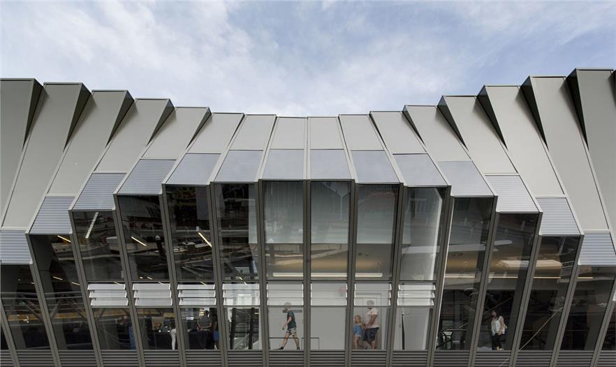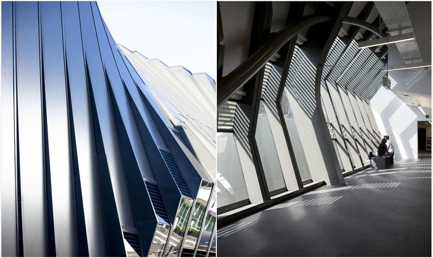 FJMT 沿著狹長形的位置修建了這個(gè)博物館,占地大概 500 平方米。建筑表面是同樣寬度鋁制材料,每一塊之間都有些微角度的相錯(cuò),構(gòu)成了略有起伏的波浪形狀,它可以配合自然光產(chǎn)生波光的感覺。這個(gè)波浪到了建筑側(cè)面的中心構(gòu)成最大面積的開口,開口處安裝了條形玻璃讓這里顯得通透。