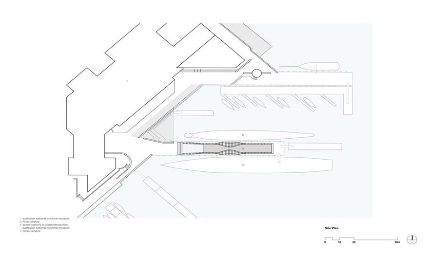 海濱展館(Waterside Pavilion)是 2015 年 11 月開放的新館,它的位置原本是 HMAS 吸血鬼號和 HMAS 昂斯洛號之間的甲板。博物館想要修建一個(gè)從甲板到達(dá)兩艘潛艇的過渡的建筑,同時(shí)紀(jì)念第一次世界大戰(zhàn)和服役 100 年的澳大利亞皇家海軍。他們邀請澳大利亞的建筑事務(wù)所 FJMT 參與修建。