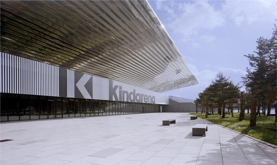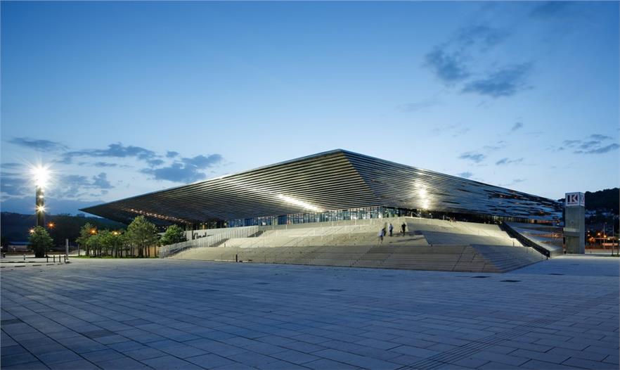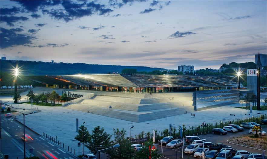 來自Dominique Perrault Architect :Kindarena體育館位于法國魯昂,由在2006年的國際競賽中勝出的本土事務(wù)所設(shè)計(jì),并于2012年落成和正式開放。巨大的臺(tái)階在空曠的場地上塑造出如山丘版的起伏,與遠(yuǎn)處連綿的山巒遙相呼應(yīng),成為城市的新地標(biāo),也引導(dǎo)著人們走向場館的入口。天氣晴好的時(shí)候,人們?nèi)齼蓛傻刈谂_(tái)階的上緣,望著腳下繁華的都市談天說地。建筑的屋頂如同臺(tái)階的鏡像,逐層后退,從厚重變得輕薄,直到最邊緣處。巨大的尖角直指天空,張力十足。而不銹鋼的表皮也為屋頂增添了一抹色彩,隨著外界的變化,反射著鋪地的白,建筑的黑,天空的藍(lán),落日的紅和夜晚室內(nèi)燈光的黃。