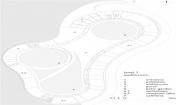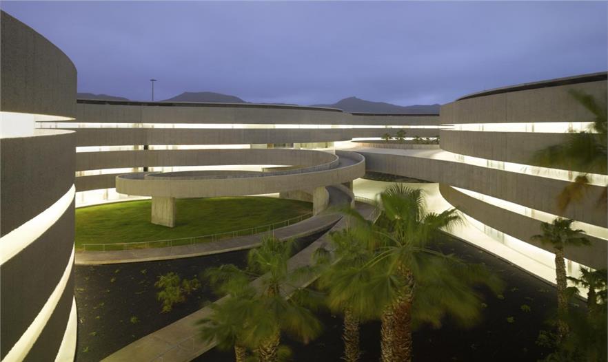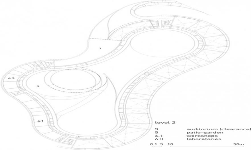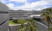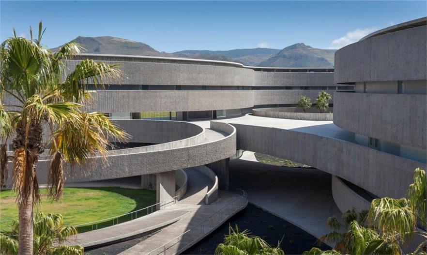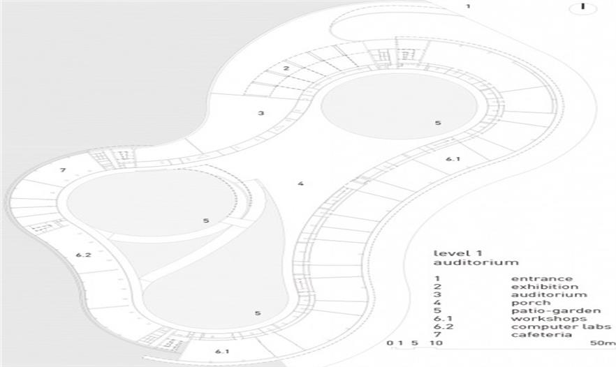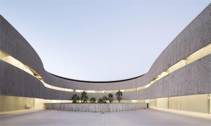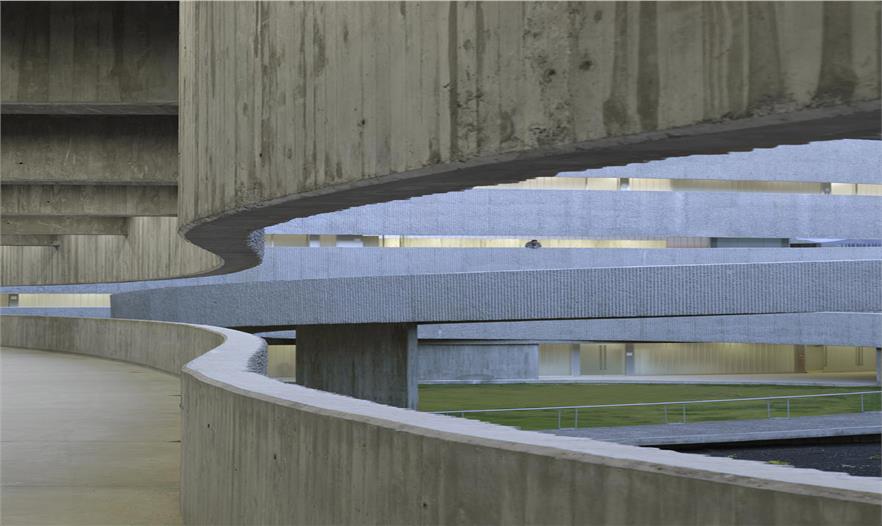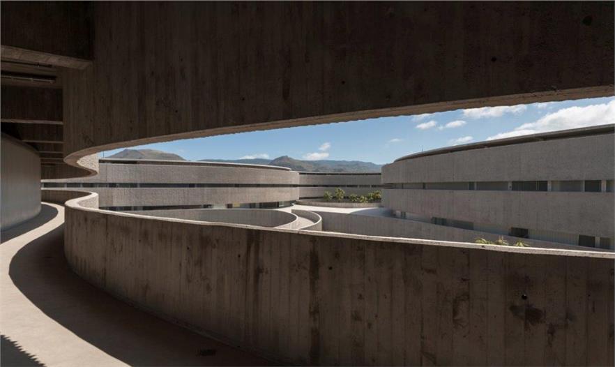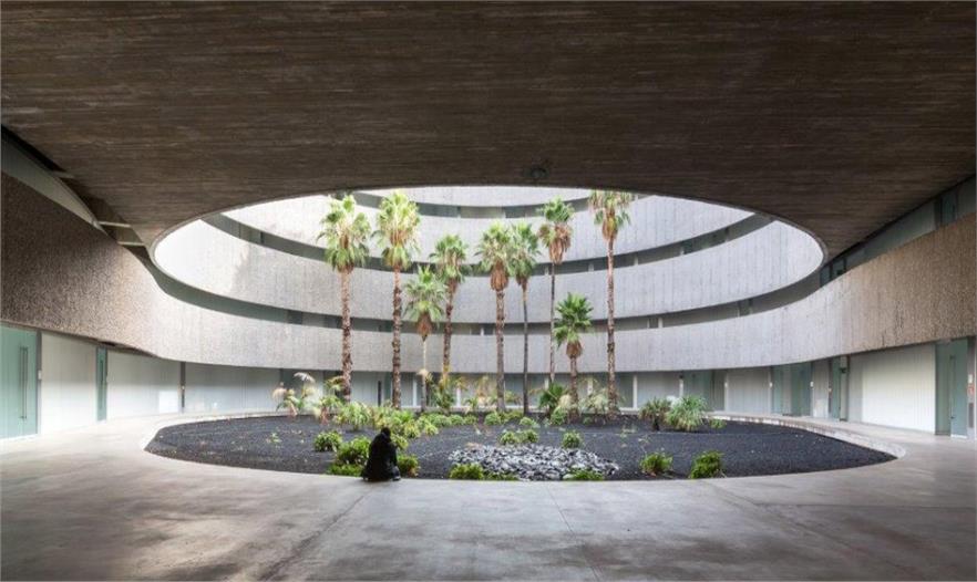 西班牙拉古納大學(xué)藝術(shù)學(xué)院的新院館位于校園邊緣地帶,毗鄰的高速路、城市干道和校園道路帶來(lái)熙熙攘攘的車流和人流。建筑師通過(guò)創(chuàng)造大量的開放性活動(dòng)空間,使建筑完全融入至復(fù)雜的環(huán)境之中,實(shí)現(xiàn)了學(xué)校建筑與城市肌理的呼應(yīng)和融合。建筑如同校園公共空間的延伸部分,蜿蜒的混凝土板在空中劃出一道道圓滑的曲線,連接起兩個(gè)園區(qū),同時(shí)也界定了建筑的邊界,圍合出層次豐富、不受外界干擾的的內(nèi)部庭院。架空的入口廣場(chǎng)寬闊開敞,俯瞰著兩側(cè)的繁茂內(nèi)庭?;虼┰綇V場(chǎng)到達(dá)對(duì)側(cè)建筑,或沿兩側(cè)的走廊行走,或順著蜿蜒的坡道下行,大量的人流在此聚集,再循著環(huán)繞中庭的半開敞廊道,分散至建筑的各個(gè)角落。