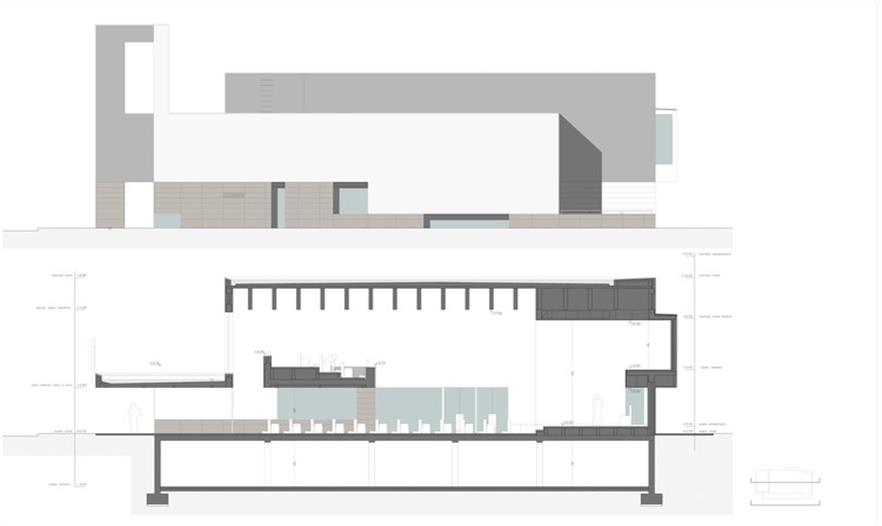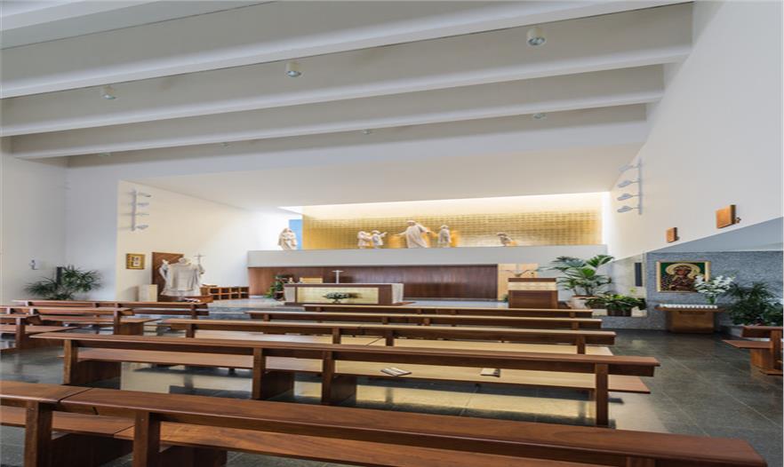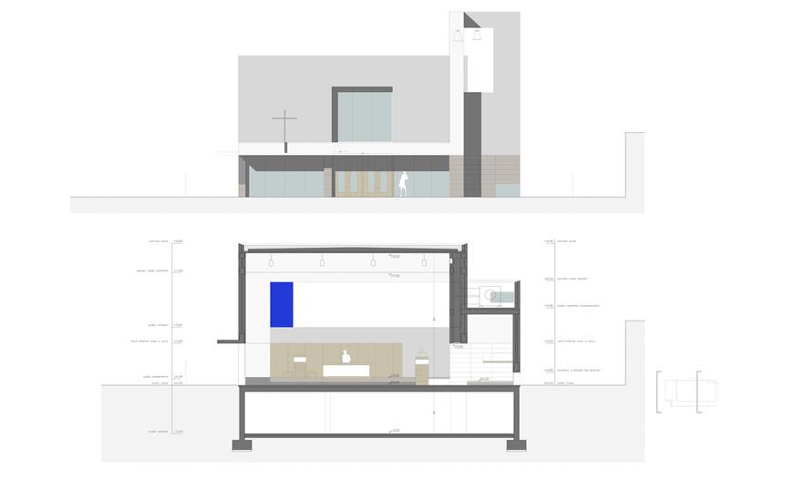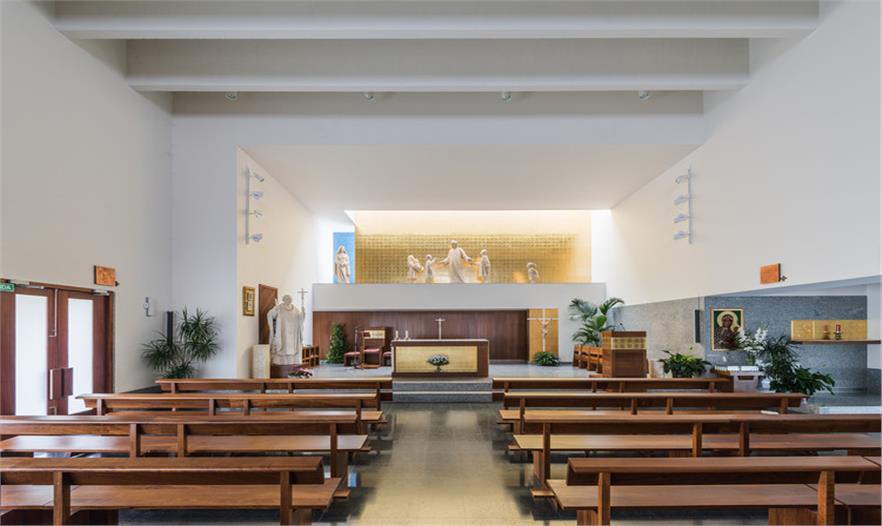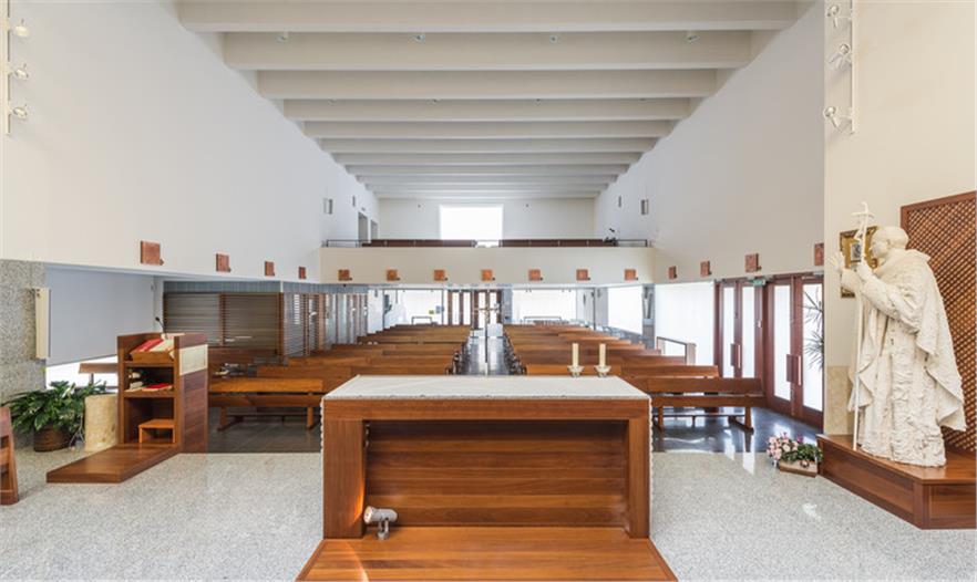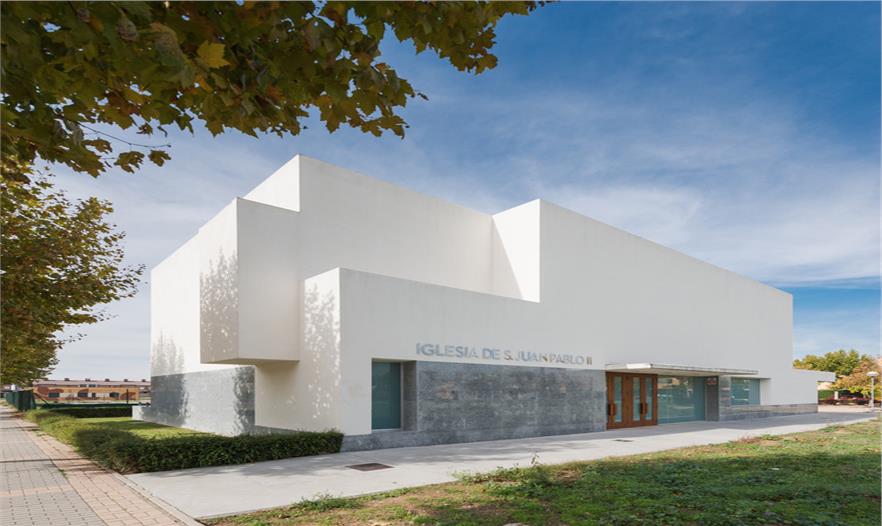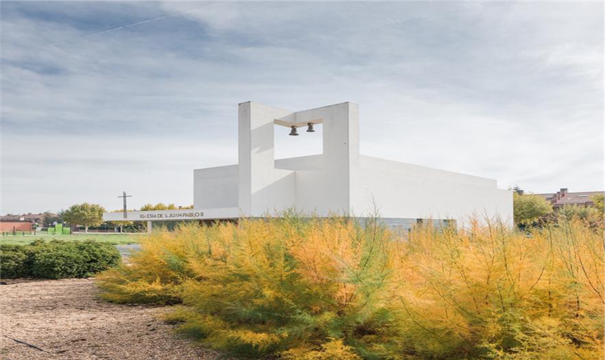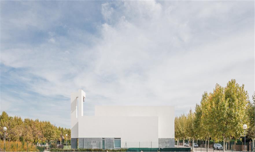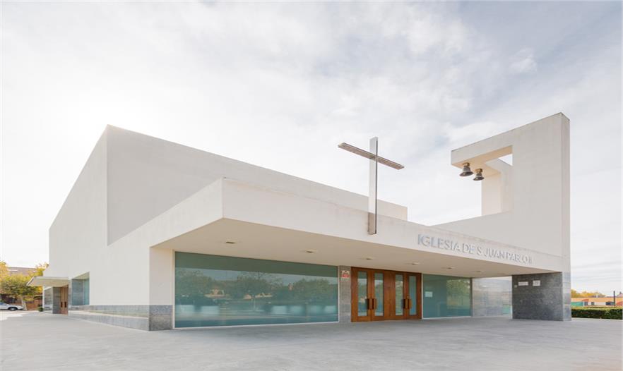 圣約翰保羅二世教堂(The Church of St. John Paul II)坐落在一個(gè)居住社區(qū)中,被綠化景觀縈繞,面向一條交通稀少的街道開口。這是一個(gè)主要服務(wù)于當(dāng)?shù)鼐用竦慕烫谩TO(shè)計(jì)建議塑造一種圓形的體量,更好地與周邊景觀相容,同時(shí)也將其作為一件精美的雕塑品彰顯其杰出的建筑地位。建筑體量被橫向打破成為不同部分,并延伸成為雨蓬,也同時(shí)是中庭和鐘樓的覆頂。這個(gè)橫向體塊作為實(shí)體存在在整體空間中,徹底重塑了建筑空間。透光的孔隙集中在與入口相連的底層空間中。整體建筑有兩種材質(zhì)組成:高度合適的花崗巖基座,以及石灰石覆頂,塑造出建筑的體量感。護(hù)欄并沒有采用其它材質(zhì),有助于實(shí)現(xiàn)其圓形體量的空間感。
