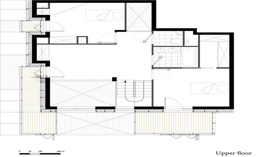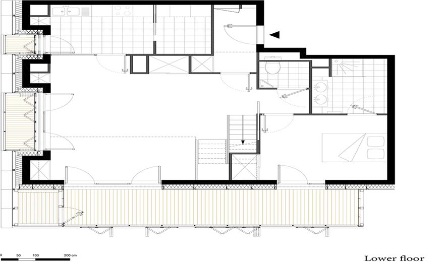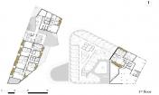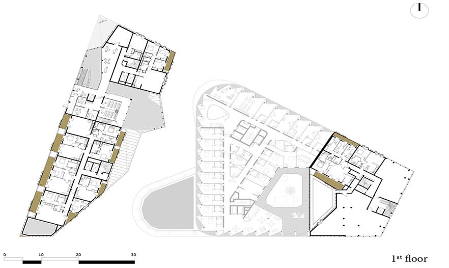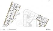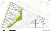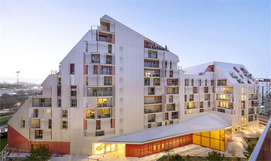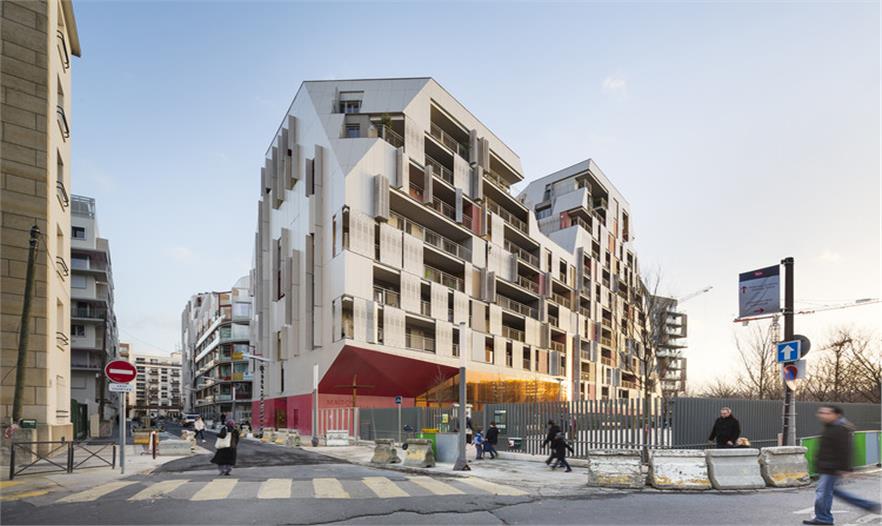 基地東側(cè)面向 rue Cardinet 的社會住房單元成為了街區(qū)的起始部分。這座緊湊的建筑結(jié)合了 Atelier Du Pont 公布的 Ehpad 老年公寓項目,社會住房共同享有地塊中部面向公園的內(nèi)院,因此增強了設(shè)計的整體性和連貫性。面向 parc Nelson Mandela 和 Batignolles 的代表性景觀,私人住房的建筑像一面棱鏡,外觀隨著時間推移而變化:在面向街道的一側(cè)表現(xiàn)出城市風貌,而面向公園的一側(cè)則表現(xiàn)出自然形式。86戶單元擁有無限的公園景觀,也享有 Saussure 街區(qū)的天際線視野。私人住房西北側(cè)面向于公園,東南側(cè)面向地塊內(nèi)部,每戶公寓都擁有面向公園或是花園的大露臺。且安裝有孔紋的推拉百葉窗避免陽光直射。