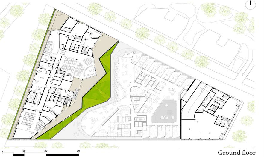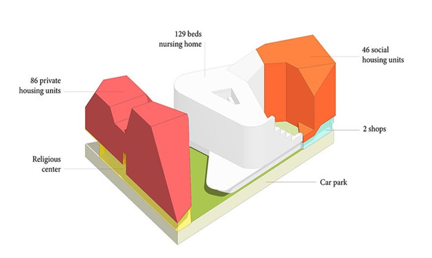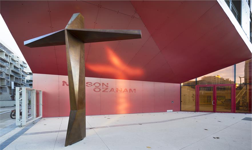 Ozanam 由一座教堂和聚會空間共同組成,位于私人住房的底層,擁有復(fù)雜的體量和橙色的暖調(diào)。在底層 rue Rene? Blum 和 Chalabre 盡端的交叉口標志出教堂的入口。雙層通高的教堂面向于街區(qū)中央的花園,塑造出寬敞的空間,成為周邊住宅大體量建筑中的喘息。