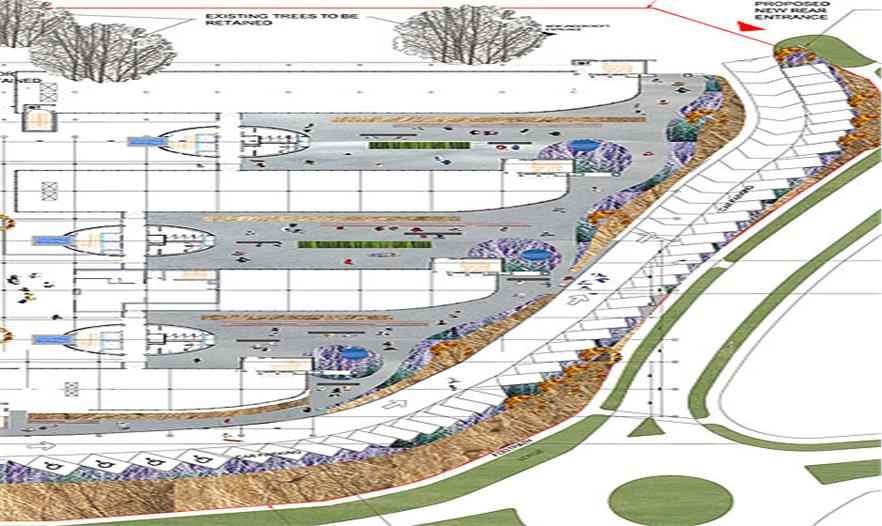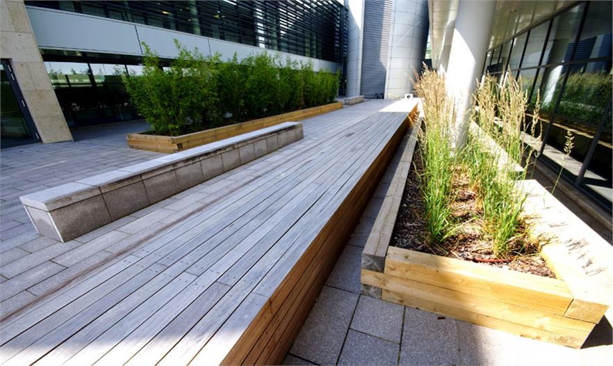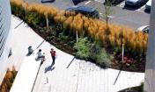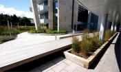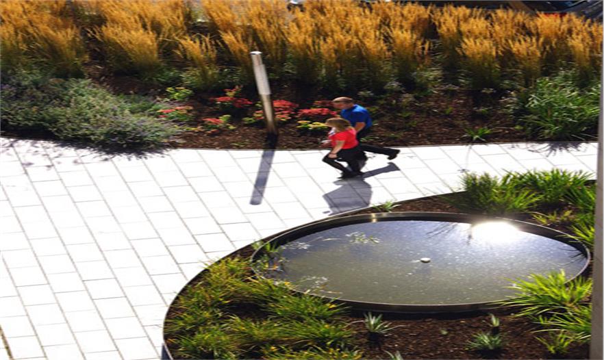 5層辦公建筑的北、東、西三面有3個庭院,逐漸會看到一個線性花園,種有繁茂的開花植物,讓這個區(qū)域的生活富有色彩、運動和野趣。該景觀由波浪狀的不銹鋼做邊界,對應4個船狀的辦公建筑,構(gòu)建建筑與景觀之間的聯(lián)系。