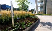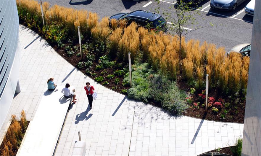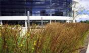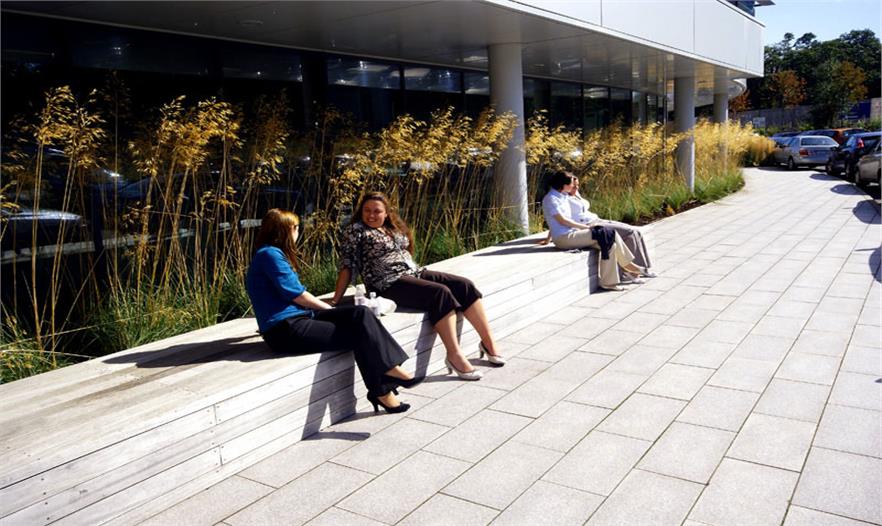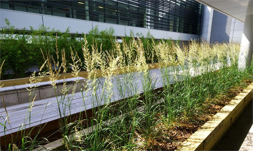 大針茅和拂子茅做為半透明的“幕簾”,將辦公空間與庭院分離開,同時還將停車場與庭院隔離開。水白樺種在蜿蜒的花盆沿線,煥發(fā)出悠悠香氣,還能屏蔽掉高速公路和停車場的景色。