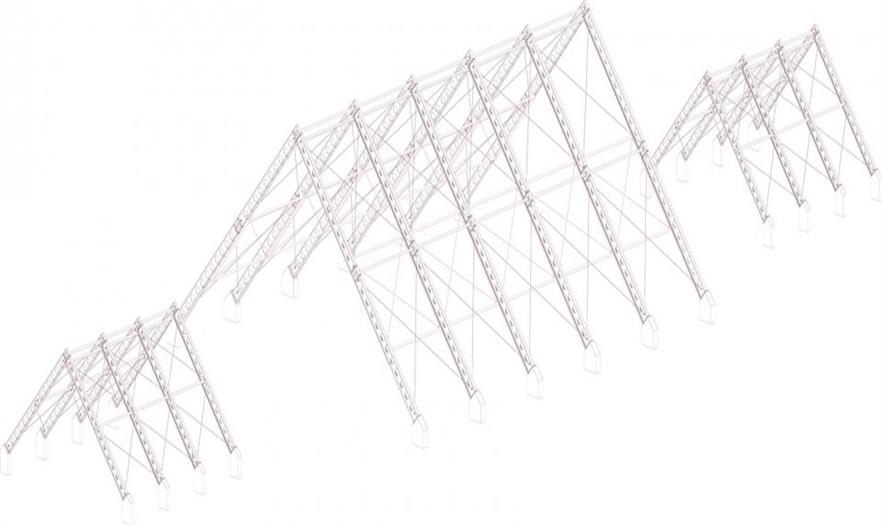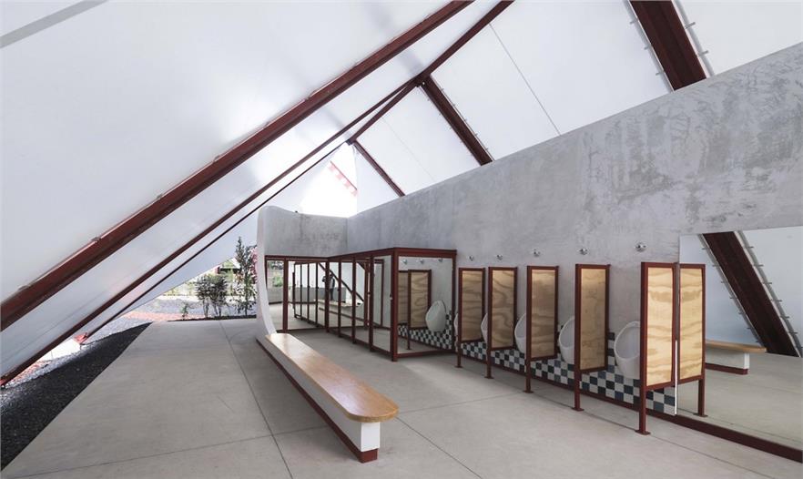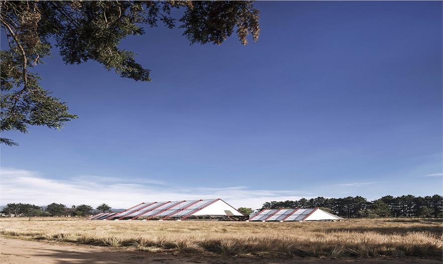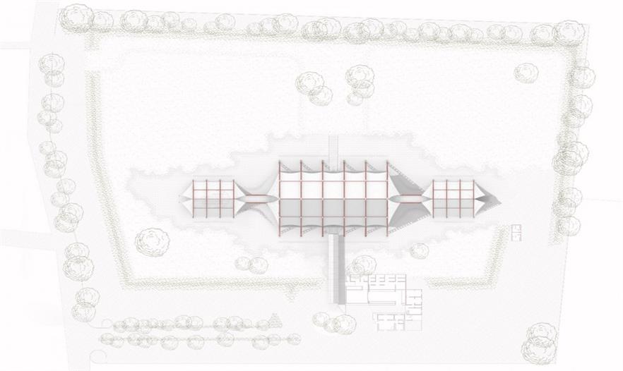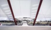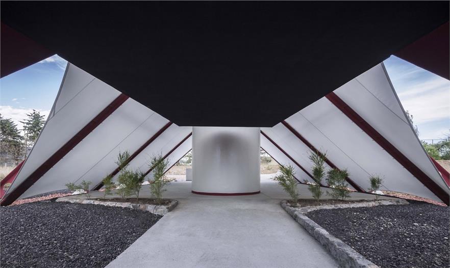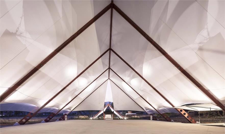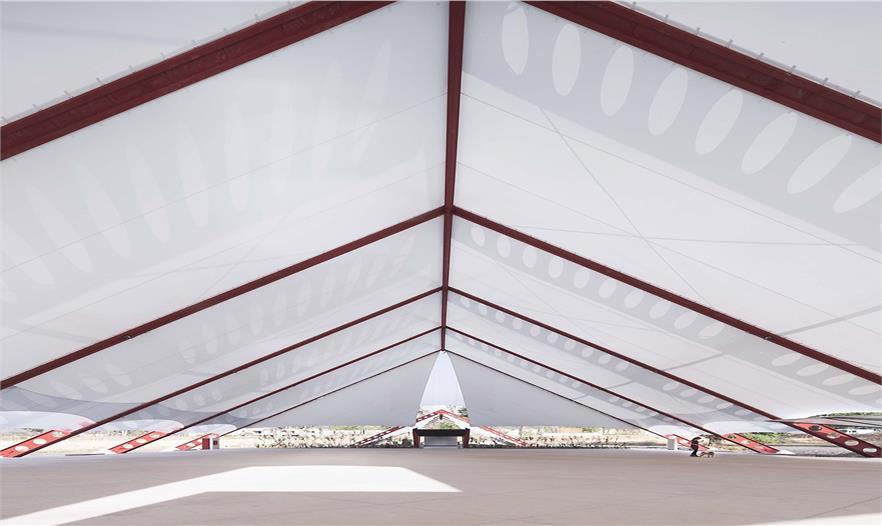 建筑的主體部分由三個帳篷結(jié)構(gòu)組成:中部面積高達(dá)1000平米 (40 x 25 米)的無柱主會場空間可承辦各式各樣的活動,內(nèi)嵌了地暖加熱系統(tǒng)的混凝土地板讓室內(nèi)空間四季如春;兩側(cè)的服務(wù)于主空間的衛(wèi)生間和廚房則占地各250平米。在外部,服務(wù)區(qū)域、設(shè)備用地、居住空間、儲物室和室外活動空間環(huán)繞而立。建筑師利用平整場地過程中清理出來的多余土方微微修改了地形,在場地的邊緣形成微微高起的矮墻,防止盛行風(fēng)大量涌入吹起帳篷結(jié)構(gòu),破壞其穩(wěn)定性。這個僅使用塑料薄膜和數(shù)字化設(shè)計(jì)、制造的抗彎輕質(zhì)鋼鐵結(jié)構(gòu)搭建而成的建筑最高點(diǎn)達(dá)到了17米。
