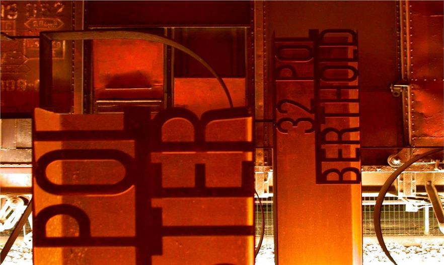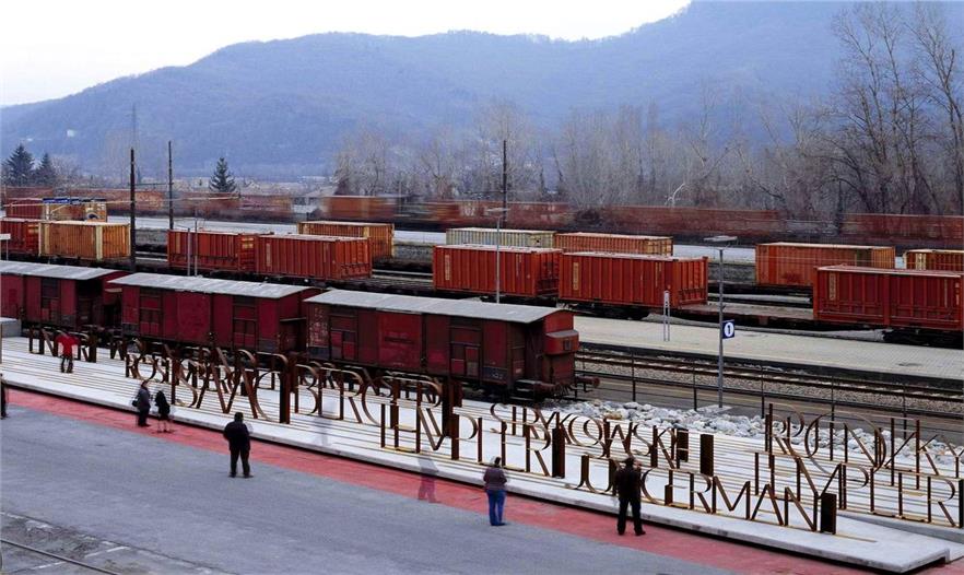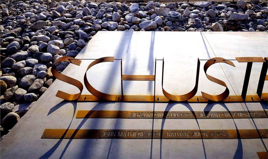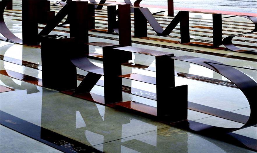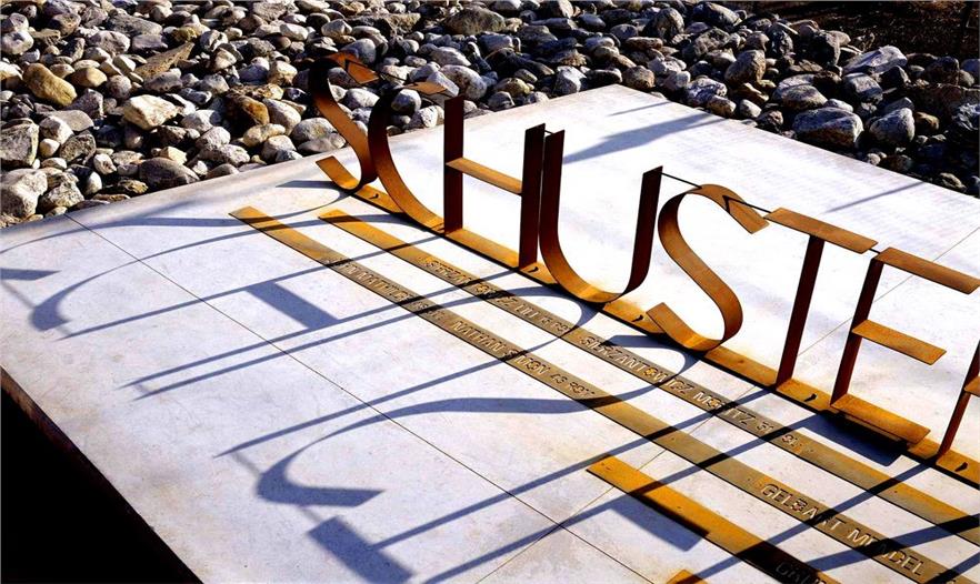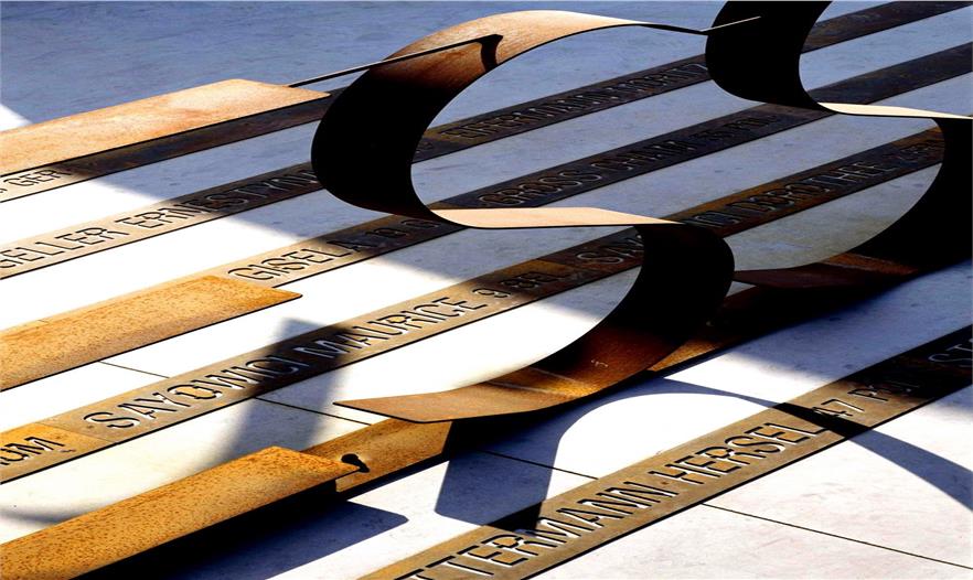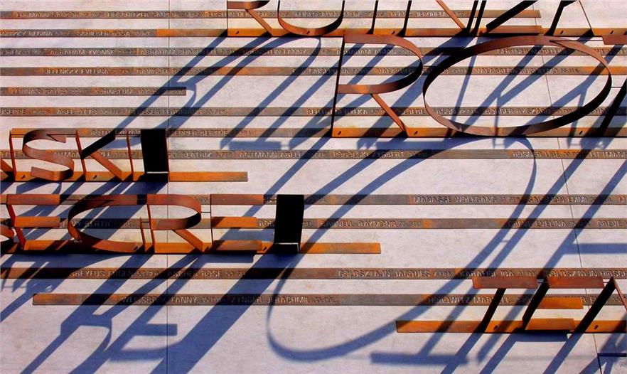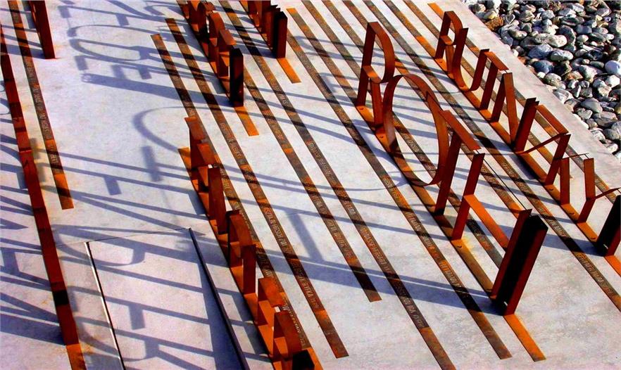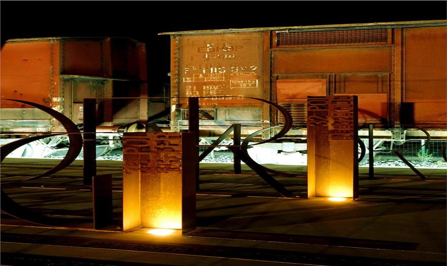 紀念碑的底座是混凝土板,略微凸出地面,看起來像是貨運車廂的站臺。站臺被不同大小的石頭所圍繞。站臺上,20位幸存猶太人的姓名以三維字母形式體現(xiàn)在耐候鋼上。350個紀念飾板用來悼念那些離開集中營再未歸來的猶太人。每個猶太人的名字都刻在金屬上,隨著時間的流逝,這些金屬的顏色會氧化成和貨源車廂一樣。紀念碑底座上裝有聚光燈,可以照亮紀念碑。貨運車廂也被一系列地上的燈光照亮,讓人們很容易地就注意到這些車廂。