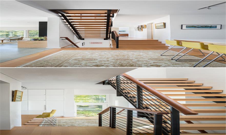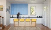 廚房里的藍、黃色增添了房屋色彩。木制和鋼鐵階梯建造出該房屋的多個層次。