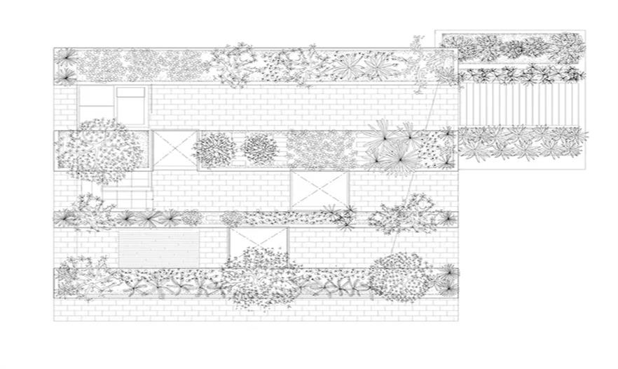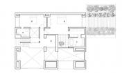 綠色植物依然能在房子內(nèi)部看到,房屋中間有三處小天井,就像一個(gè)小的方形庭院,它同樣有借光的作用。黑色鐵框的玻璃窗是最簡單的一種,光線和綠植都可以最大化看到,不會(huì)干擾到視線。如果翻看過武重義的項(xiàng)目會(huì)發(fā)現(xiàn),幾乎全部都與綠色植物有關(guān),或者用竹子這類環(huán)保材料建造,或者在屋頂上種上綠植,而這個(gè)項(xiàng)目也不例外。因?yàn)閳龅氐南拗?,花園就鋪在了屋頂上。不同的是這一帶建筑要求使用傾斜的屋頂,武重義他們就用間距較大的臺(tái)階代替,種上 4 排綠植,其余地方覆蓋上傳統(tǒng)的瓦片。從遠(yuǎn)處望去,屋頂?shù)木G植和周圍的樹木連在一起,有田園的寧靜安逸。室內(nèi)外都使用了最簡單的白色磚墻,契合鄉(xiāng)土的氣氛也帶給人清爽的審美。