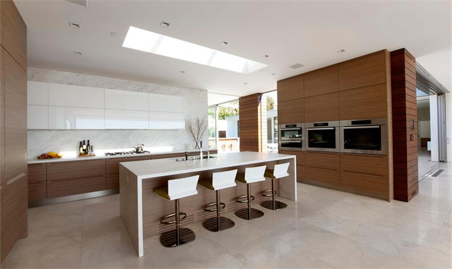 廚房?jī)?nèi)上層白色櫥柜與該島相匹配,其他櫥柜是由木頭構(gòu)成的。