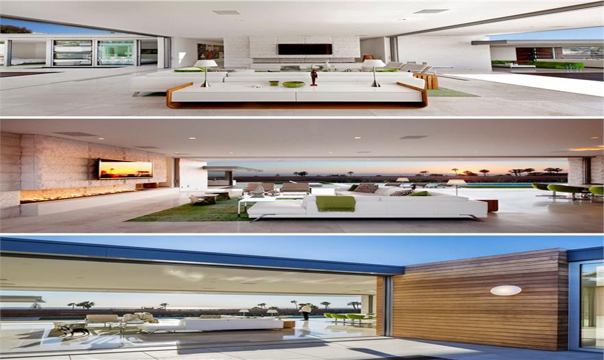 起居室顏色青春靚麗,放置橙綠色沙發(fā),打開窗戶能看到游泳池的景色。第二個(gè)起居室和用餐區(qū)兩邊都對(duì)室外開放。