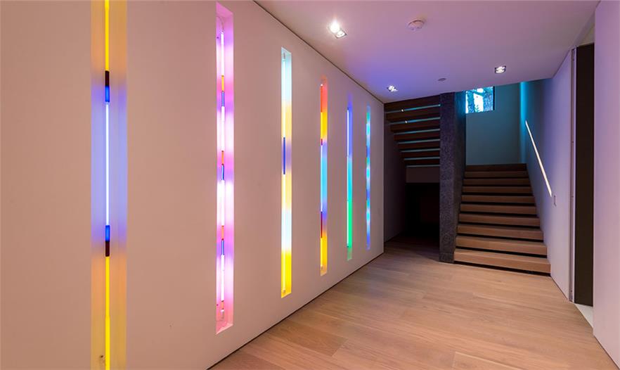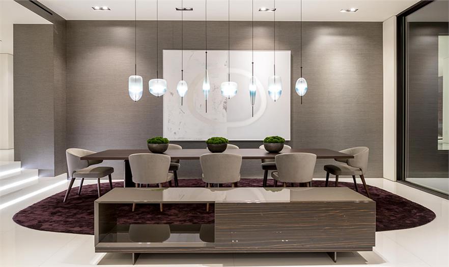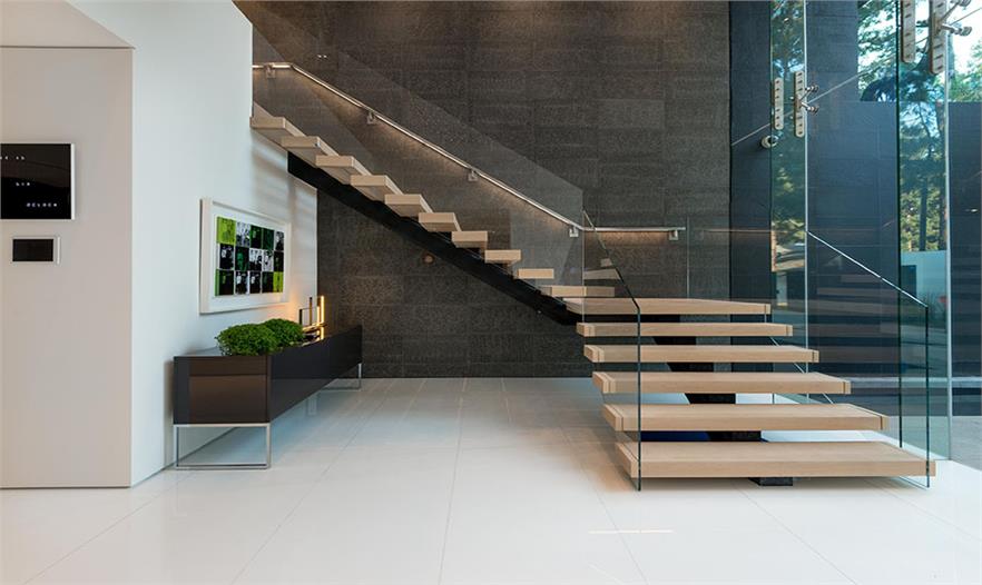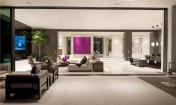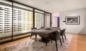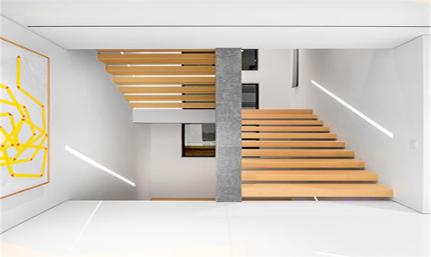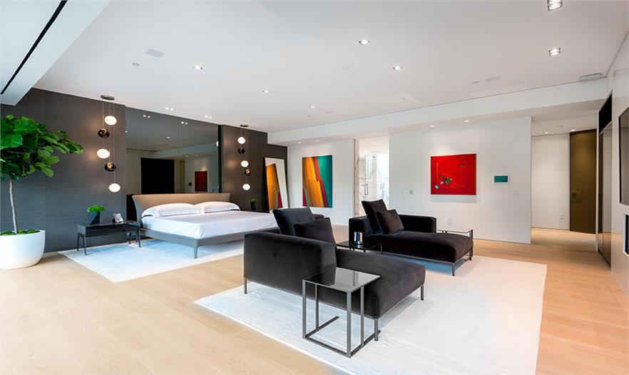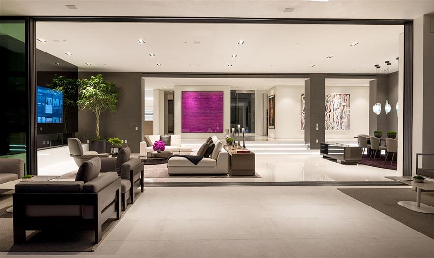 該住宅以大型的公共空間為中心設(shè)計(jì),第一層是小型和大型休閑的完美區(qū)域。兩層式入口和樓梯位于該房屋的前面。私人門后面有一個(gè)2車位的車庫,地下室停車場有一個(gè)3車位的車庫。2層有許多私人臥室套房,帶有健身房和室外門廊。該住宅占地約1300平方米(1.4萬平方英尺),還不包括庭院、甲板、露臺(tái)、水景、溫泉和游泳池。在主樓層下面還有額外設(shè)施,如媒體室、酒窖和另外的一個(gè)3車位車庫,人們可通過樓梯和電梯到達(dá)。材料配置溫暖且具現(xiàn)代化,普遍使用木材和石頭,放大自然裝置以及加利福尼亞現(xiàn)代住宅的感覺。