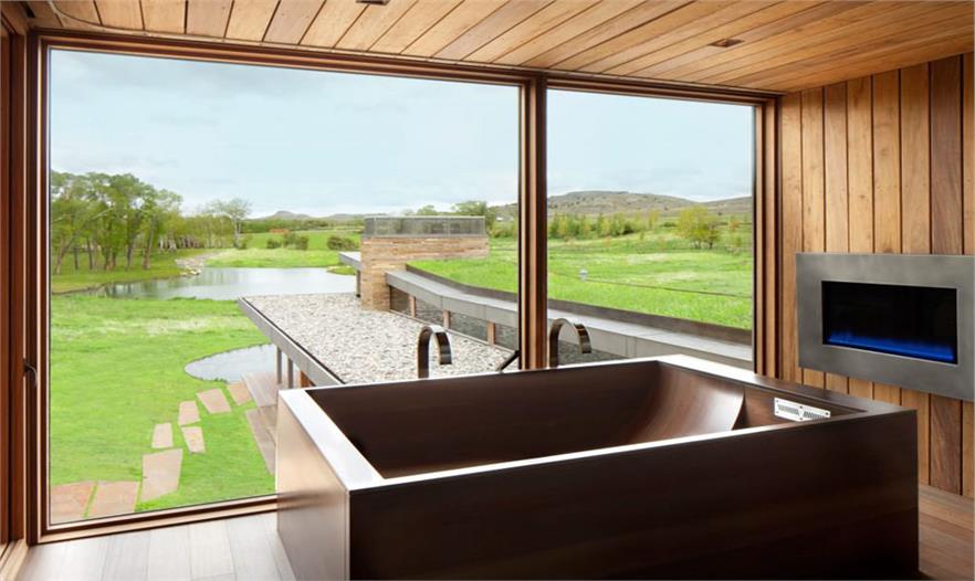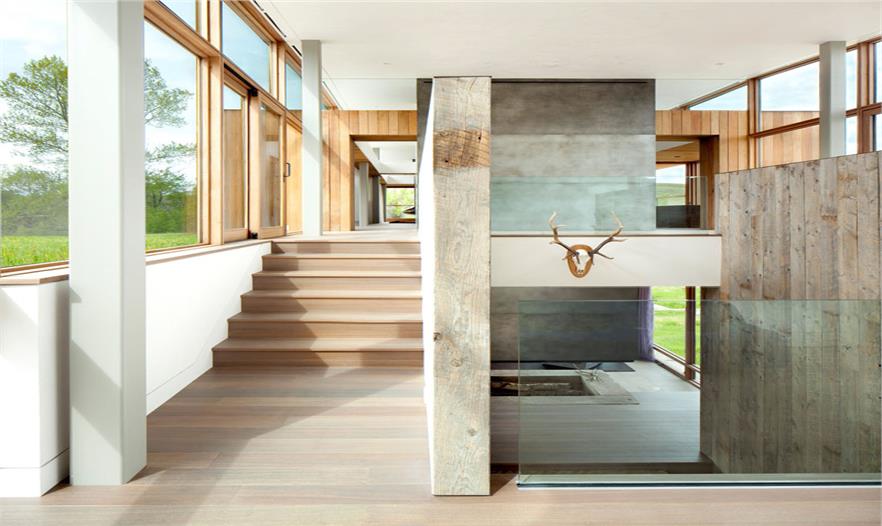 陽光透過大型窗戶射入到木制臺階上,配有玻璃欄桿,直接向上進入二層。臥室三面都是窗戶,可進入一個小型陽臺欣賞河景。房間內(nèi)有壁爐不會變冷。在盥洗室,木制浴缸和壁爐讓人放松的同時還能欣賞景色。