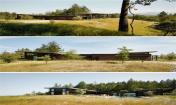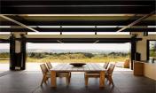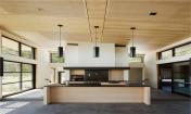 4個超大型、滑動玻璃板設(shè)在主起居室的每一邊,營造戲劇化效果,室內(nèi)外無縫連接,在熱天有助于空氣流通。簡單的木制餐桌和椅子將廚房與起居空間分開。陽光透過高大的天花板和額外的窗戶射入空間,而且木制廚房配有黑色木板,與窗棱相匹配。