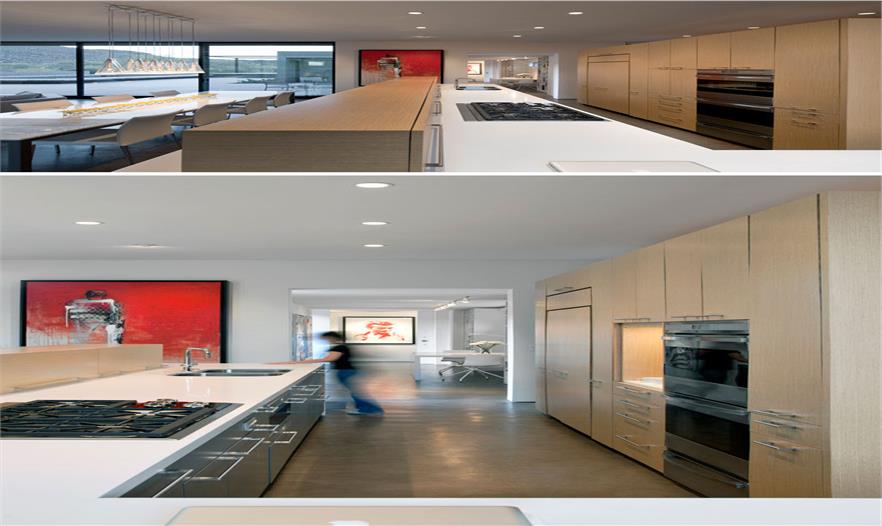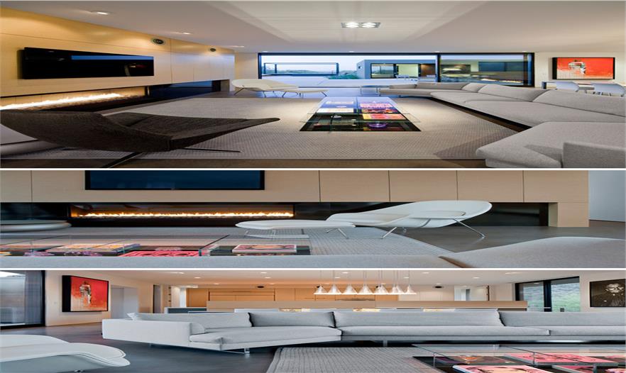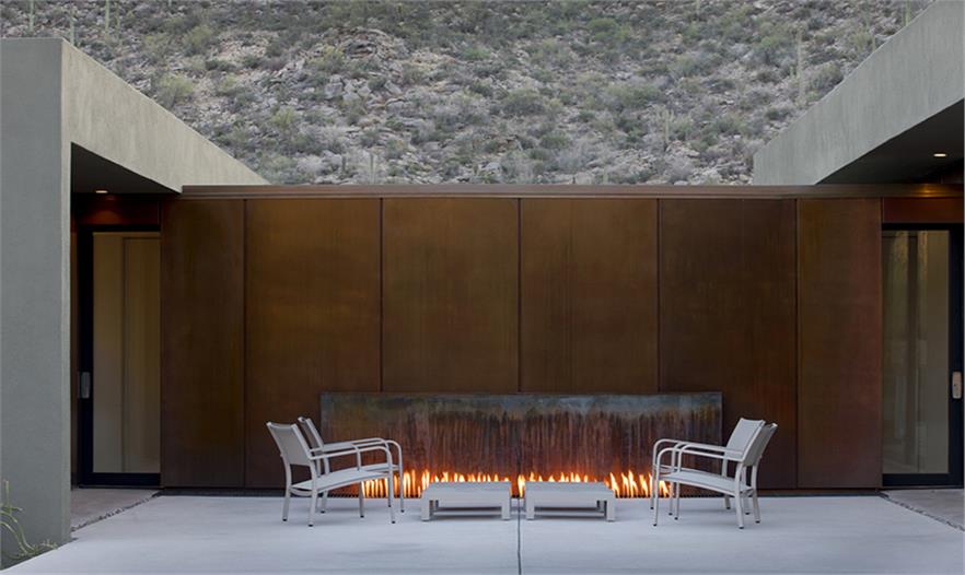 戶外壁爐由風化鋼環(huán)繞,位于泳池附近以及該住宅2個不同區(qū)域之間,泳池和戶外壁爐的一邊是主起居室,也有一個壁爐。起居室后面是用餐區(qū)和廚房。一系列吊燈幫助定位該空間的餐桌。