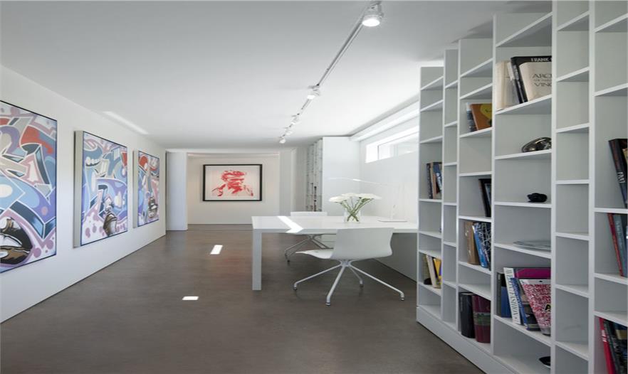 隨著廚房往里走就是一個全白的走廊,也就是該住宅的圖書館,有各種各樣的藝術(shù)品、落地書櫥和小桌子。