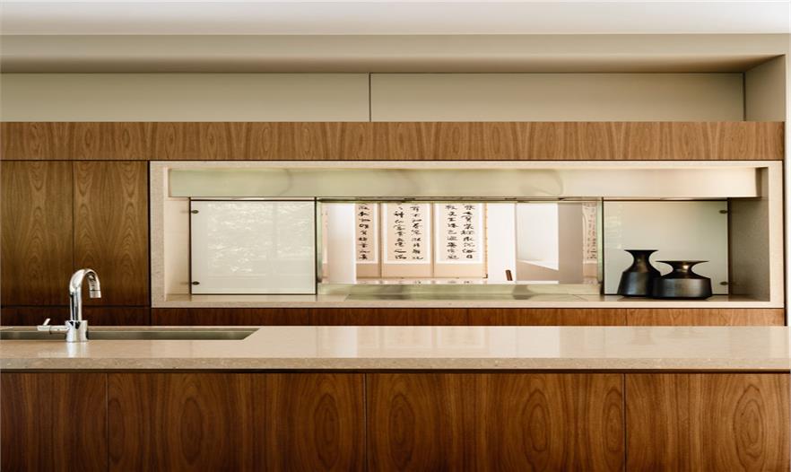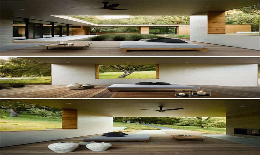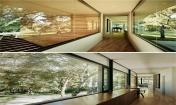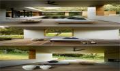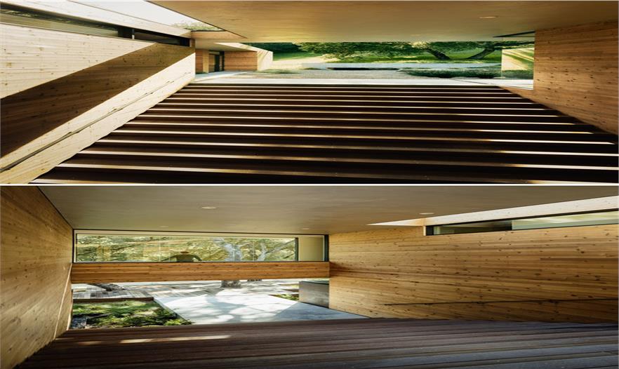 該住宅全部使用落地窗,能觀賞到周圍景色。整個(gè)房間都是使用的像混凝土、風(fēng)化鋼、天然雪松這樣的材料,模擬戶外大自然的形態(tài)和顏色。該住宅的一邊是主起居室和戶外空間,另一邊是客房??头康膶?duì)面是一個(gè)有屋頂?shù)臏厝龊托⌒偷淖粎^(qū)。另一個(gè)有屋頂?shù)膽敉鈪^(qū)是一個(gè)起居室,設(shè)有休息用的沙發(fā)床。墻壁的切口能看到一棵獨(dú)立的大樹,就像一幅畫。在沙發(fā)床對(duì)面是一個(gè)混凝土環(huán)繞的壁爐和儲(chǔ)存木柴的地方。隨著戶外起居室一邊的道路,就會(huì)到達(dá)帶有壁爐的高地區(qū)。